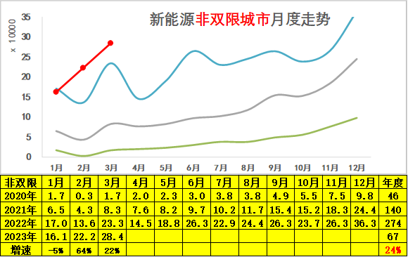 2022 年非双限城市累计达到 274 万台水平,同比增长 96%,呈现了强势增长特征。2023 年新能源车在非双限城市的表现极其优秀, 3 月份销售 28.4 万台的增速 22%。