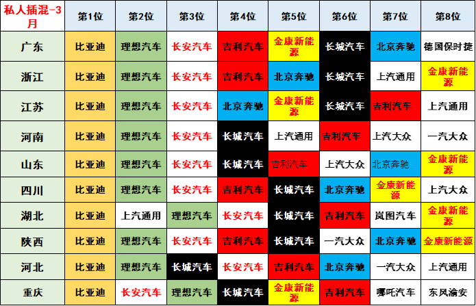 私人插混市场的比亚迪和理想汽车的表现较强,尤其是比亚迪的主力城市全面领先,理想汽车全面位居第二。长安、上汽也是走势较强。
