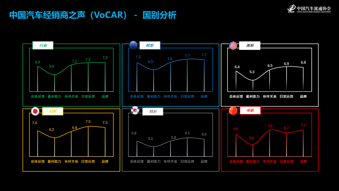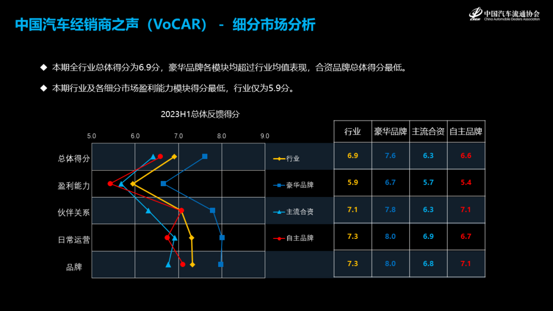 最新一期中国汽车经销商之声 2023 H1 冬季版的调研,得到了312个经销商集团,4216个经销商的大力支持,覆盖全国58个品牌,总计获得有效问卷9850份。我们的主要结论是,这一期行业总体得分是6.9分,大幅低于去年同期的调研结果,反映出经销商的整体满意度和信心度都低于去年。