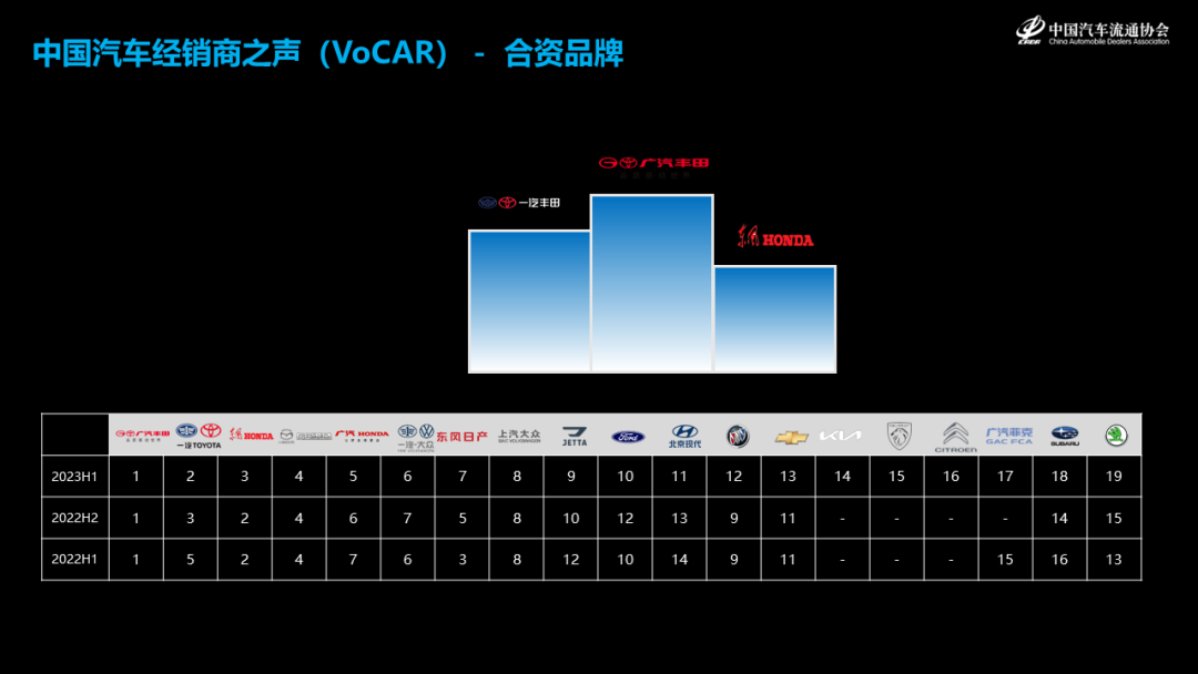 自主品牌来看,比亚迪品牌经销商满意度和信心度最高,2022年销量增速迅猛,主要得益于产品力的提升,渠道的大发展。长安汽车排名第二,表现也十分亮眼。排名第三的广汽埃安品牌,受益于新能源产品的销量增长,排名相比去年有明显提升。
