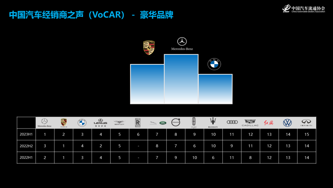 从细分市场来看,豪华车品牌,奔驰,保时捷,宝马,雷克萨斯占据了前几名。本次调研,是最近几年第一次奔驰品牌超越了保时捷品牌荣登榜首,奔驰品牌在2022年持续做好厂商和经销商的沟通,并及时解决经销商盈利的相关问题。保时捷品牌在2022年下半年出现了产品结构问题,主要体现在Macan车型,好在厂家已经重视并且开始解决,希望2023年不要出现类似的问题。雷克萨斯品牌需要引起警惕,2022年的销量下滑,产品力和经销商盈利问题出现,需要厂商和经销商予以重视并加以解决。