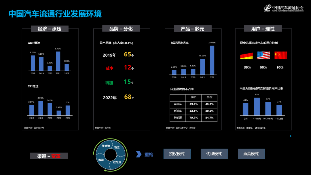 汽车流通行业,受整体宏观经济,厂商和品牌的竞争态势,消费者的消费倾向变化,渠道模式等多种因素的影响。过去这几年,受到整体的大的经济环境影响较大,我国的GDP增速放缓,衡量通货膨胀的重要指标CPI增速一直在低位运行,中国政府正在采取有效的政策措施来刺激经济增长,促进经济结构的调整和转型。根据麦肯锡《2023麦肯锡中国汽车消费者洞察》的数据,中国的量产品牌,市占率大于0.1%的品牌,2019年为65个,2022年是68个,这期间12个品牌退出了量产品牌序列,15个新品牌加入了。品牌的发展分化特征明显。