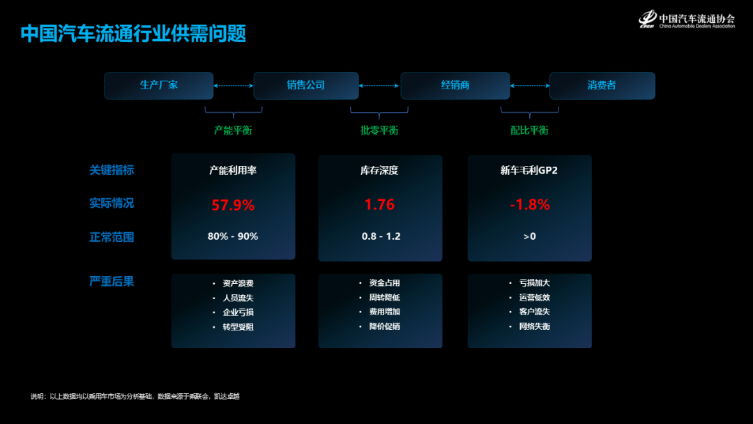 配比平衡,我们重点关注经销商的新车毛利GP2, 凯达卓越统计的2022年乘用车品牌,月度平均值为-1.8%,没有到达盈亏平衡点。经销商亏钱卖车,前面提到了批零失衡造成的高企的库存压力,如果车型和配置不是消费者所需要的,产品力和价格力都弱于竞争品牌的时候,会产生GP2严重亏损的问题。在面向消费者的终端环节,供需关系的风险被最终放大,经销商的亏损加大,运营效率大大降低。如果长期持续,品牌力受损,客户更加不会选择该品牌以及经销商,造成客户流失,从而影响网络信心,造成网络失衡。