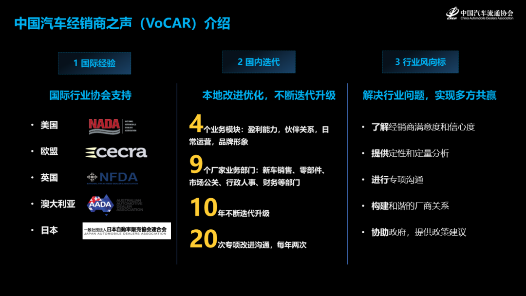 中国汽车流通协会致力于中国汽车流通市场的健康发展,倾听经销商的声音,反馈行业共性问题,协调厂家和政府相关部门进行协商解决。我们的中国汽车经销商之声VoCAR这个调研,迄今为止已经做了10年,每年两次。中国汽车经销商之声调研,得到了国际行业协会的大力支持,美国,欧盟,英国,澳大利亚,日本等国家和地区的行业协会,我们一直就经销商之声的调研同步更新,互相取长补短。我们也不断进行问卷设计和调研方法的迭代升级,10年来进行了20次的更新优化。通过对经销商的满意度和信心度的调研,提供定性和定量分析,基于调研结果进行专项沟通,协助政府提供政策建议,从而构建和谐的厂商关系。