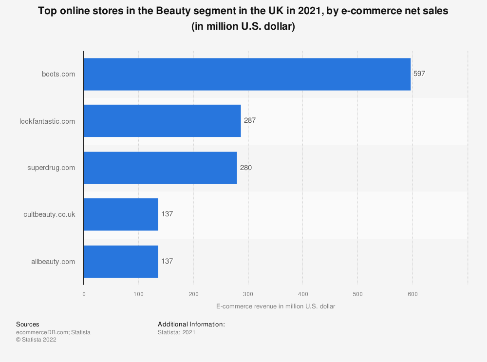 2022年英国领先的美容和健康网上商店按品牌知名度排名情况。数据来源:Statista.com