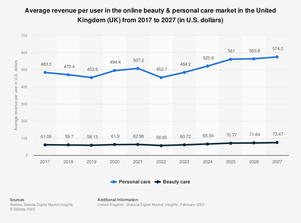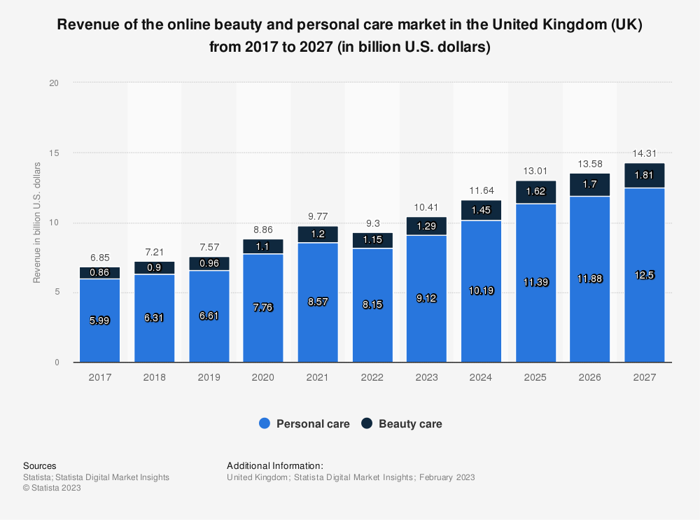 在英国,美容和个人护理的电子商务市场在2022年达到93亿美元。这一年,个人护理行业创造了81亿美元的收入,而美容护理行业创造了12亿美元。到2027年,整个市场的收入预计将超过140亿美元。