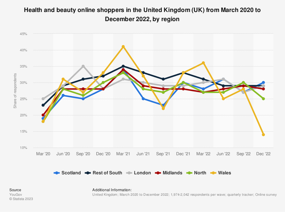 2020年3月至2022年12月英国的健康和美容在线购物者,按地区划分。数据来源:Statista.com