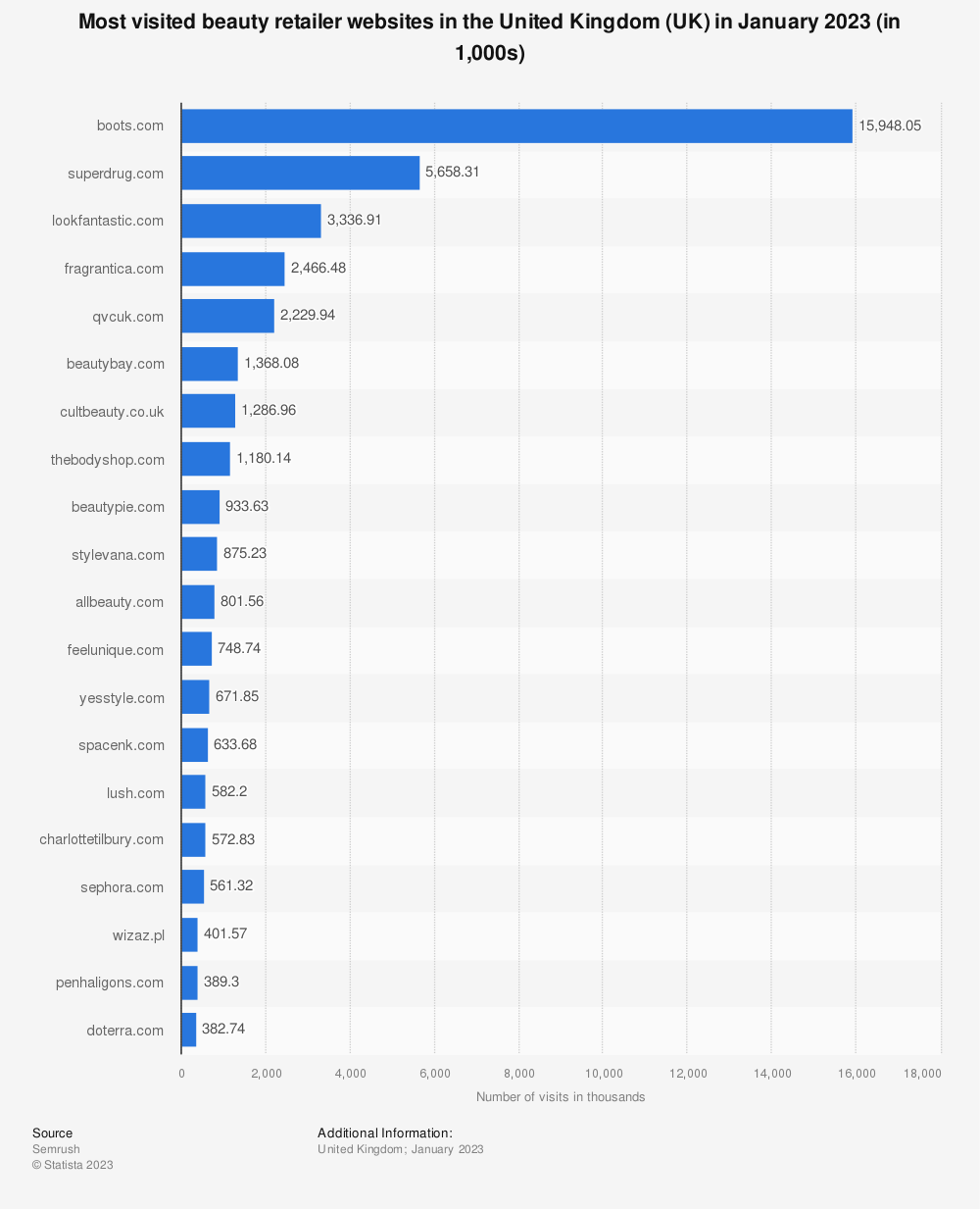 2023年1月英国访问量最大的美容零售商网站(以千人计)。数据来源:Statista.com