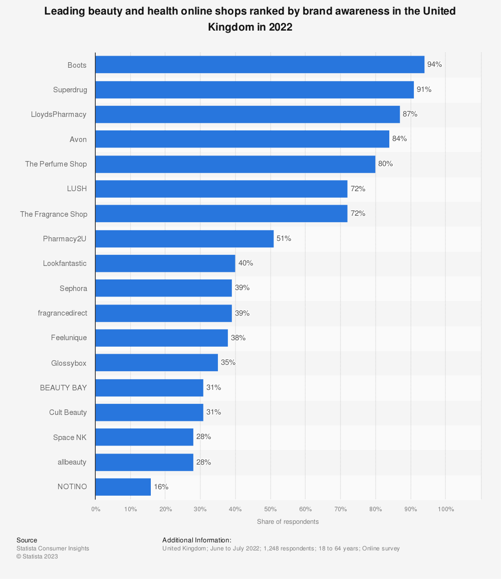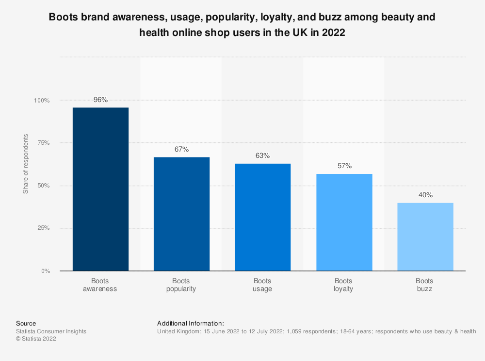 当谈到美容和健康在线商店用户时,Boots在英国的品牌认知度为96%。这项调查采用了辅助品牌识别的概念,向受访者展示了品牌的标志和书面品牌名称。