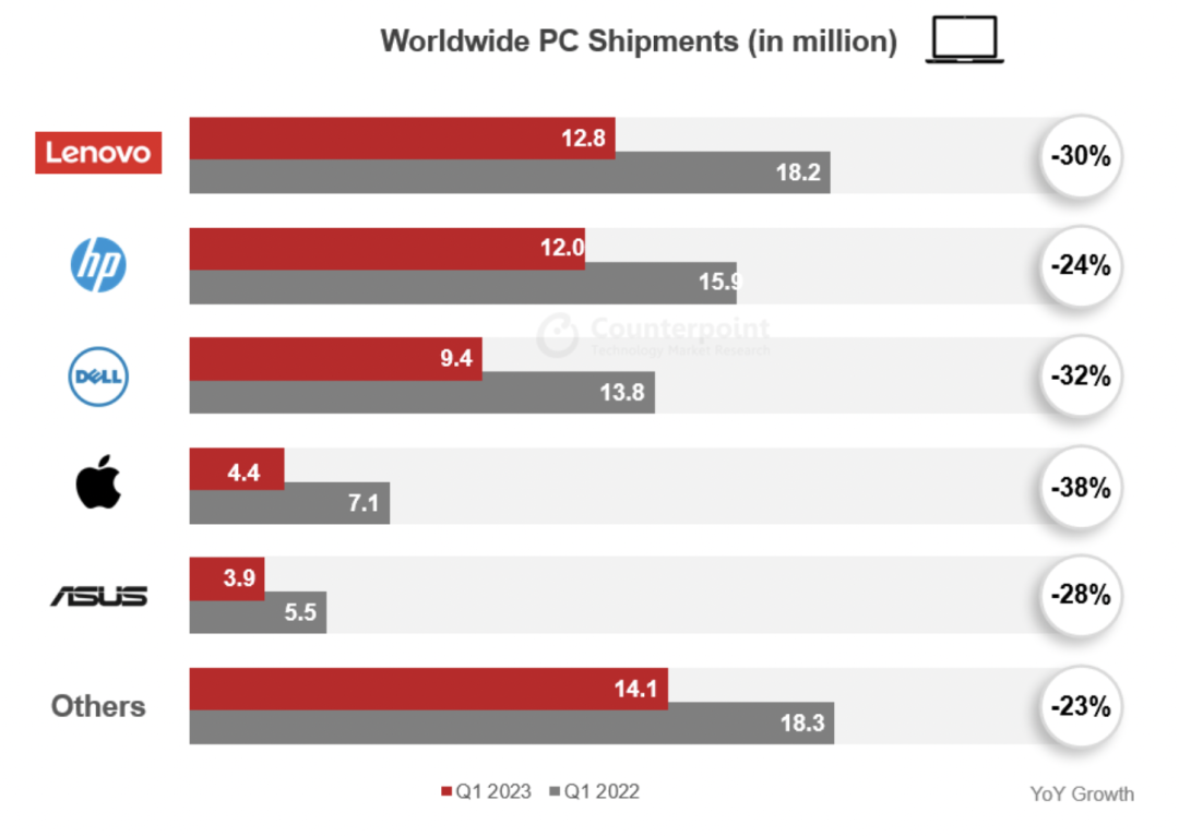 - 2023年第一季度全球PC出货量年同比下降28%。