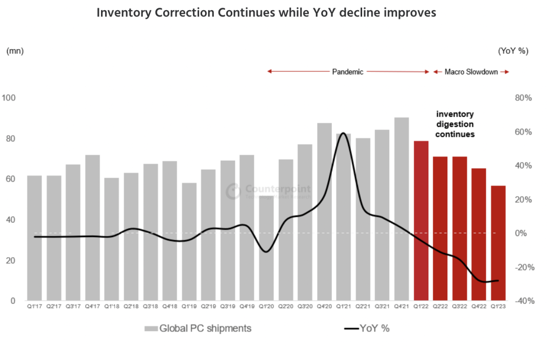 - 尽管PC需求预计将在2023年下半年逐渐复苏,但全年出货量将以两位数的百分比下降。