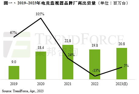 据TrendForce集邦咨询最新调查显示,2022年电竞监视器市场受高通胀冲击,出货量自2016年来首度面临衰退,仅达1,980万台,年减13%。TrendForce集邦咨询预估2023年电竞监视器市场将恢复成长,出货量约2,080万台,年增5%,带动成长因素主要有三,其一,部分品牌采用100Hz机种去取代原先75Hz类电竞产品;其二,杭州亚运于2023年第三季举办,电竞赛事也是比赛项目之一,将助益电竞产品需求增加;其三,疫情过后网吧需求逐渐复苏。
