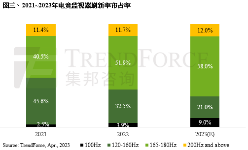 以电竞产品刷新率而言,2022年以165~180Hz 的51.9%市占率为最高,其次是120-160Hz的32.5%,而200Hz以上产品市占率约为11.7%,而100Hz则仅3.9%。TrendForce集邦咨询预估,2023年市占率增加较为明显的是165~180Hz及100Hz产品,其中,因165~180Hz 与120~160Hz产品价差不大,120~160Hz市占率会持续被165~180Hz侵蚀。而100Hz则主要是取代75Hz类电竞产品市场,因此市占率可能在2023年增加5.1个百分点,达到9.0%。此外,2023年除了电竞监视器新开发100Hz产品外,也有部分品牌将100Hz产品应用在商务机种,甚至非电竞的消费机种上(本文提到的100Hz市占率仅计算电竞产品)。