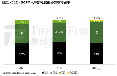 从电竞面板类型来看,TrendForce集邦咨询指出,2022年电竞监视器仍以VA液晶产品市占率最高为51%,其次为IPS液晶产品,市占率为43.4%,TN液晶产品市占率仅约5%,值得注意的是,OLED电竞产品在2022年开始崭露头角,市占率达到0.6%,而随着OLED产品逐渐多元化,2023年市占率有望上升1.6%。此外,2023年IPS电竞监视器市占率有机会与VA电竞产品抗衡,主要是IPS产品市占率日益增加,加上多数IPS电竞面板价格持续降低所致。