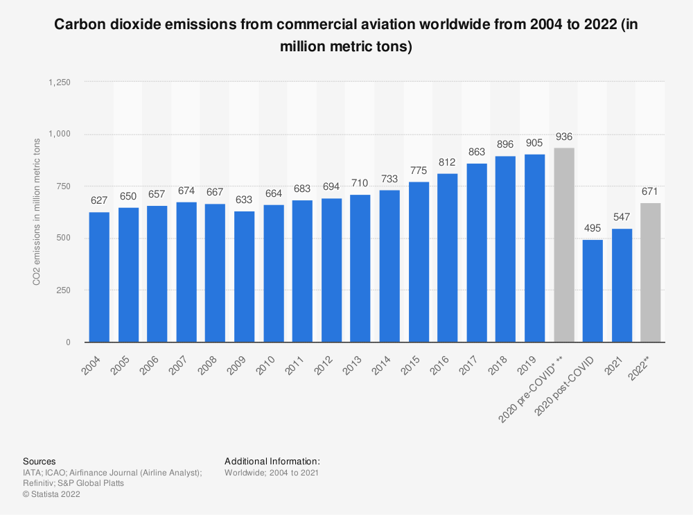 2004年至2022年全球商业航空的二氧化碳排放量(单位:百万公吨)。数据来源:Statista.com