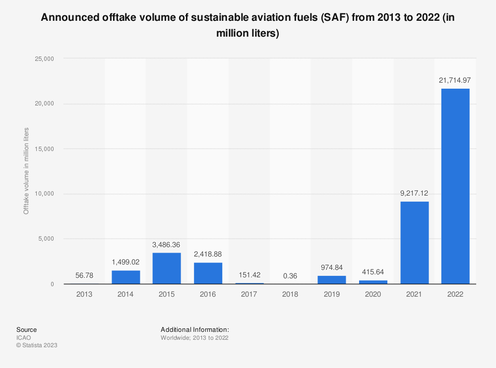 公布的2013年至2022年可持续航空燃料(SAF)消耗量(单位:百万升)。数据来源:Statista.com