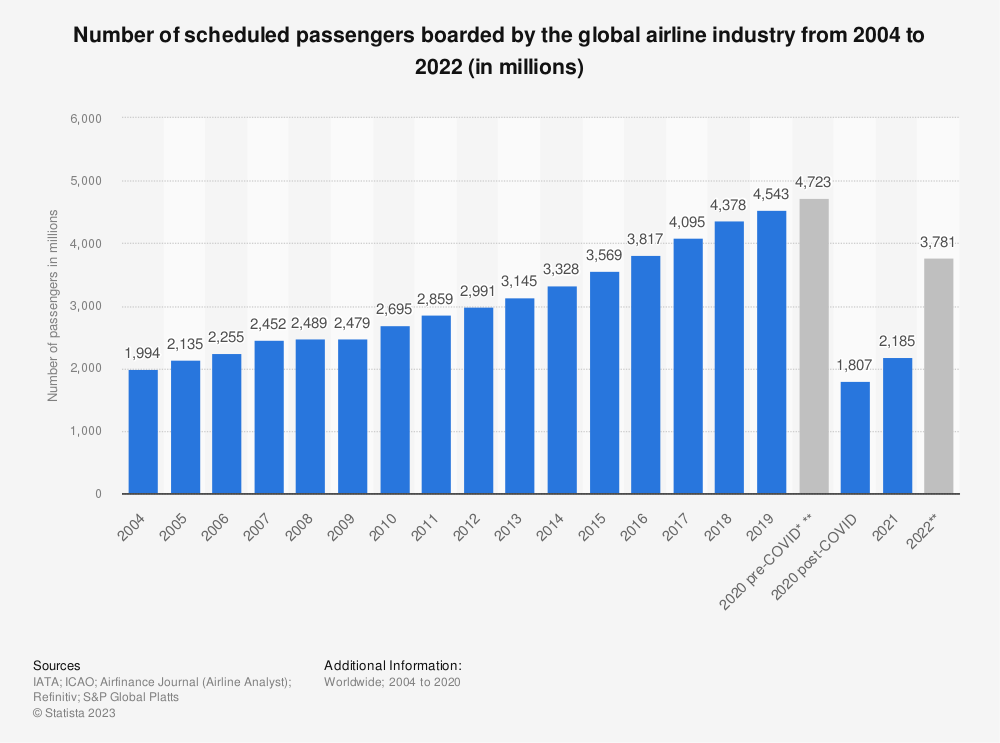 2004年至2022年全球航空业预定登机人数(单位:百万)。数据来源:Statista.com