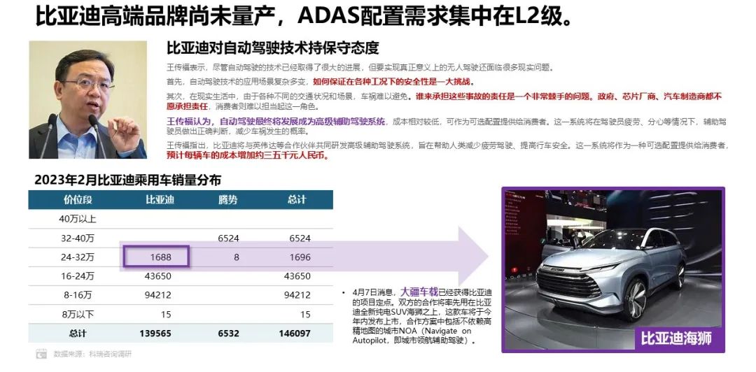 近期,主打低成本高阶辅助驾驶的大疆车载已经获得了比亚迪海狮的配套机会。同时,比亚迪仰望品牌也已经发布,将推动比亚迪高阶辅助驾驶系统的开发。预计比亚迪将在高端产品采用英伟达与比亚迪合作开发的高阶辅助系统,低端产品采用大疆车载一站式配套的技术布局。