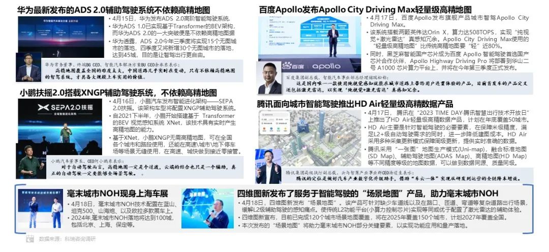 为留住客户,百度和腾讯都在本届车展发布了轻量级的地图产品,来满足L2+级辅助驾驶的需要。四维图新更是与毫末智行深度合作,推出场景地图产品,保证毫末城市NOH的使用城市数量在2024年达到100个。