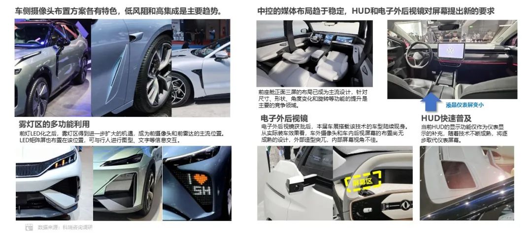 辅助驾驶和智能座舱的技术升级不断加速,摄像头和屏幕数量不断增加,迫使汽车厂商需要在车身和内饰预留更多的位置进行布置,同时还要保证外形设计达到美观时尚的效果。在本届上海车展,出现了很多既美观,又功能强大的车侧摄像头布置设计。雾灯区域也因为雷达和摄像头的增加,实现了布局升级,并可配置LED矩阵屏幕,使车辆与行人之间可进行图形和文字的信息交流。