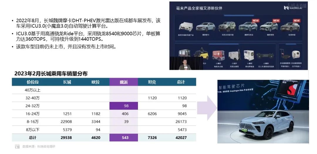 2022年8月,长城魏牌摩卡DHT-PHEV激光雷达版就已经在成都车展发布,该车采用ICU3.0(小魔盒3.0)自动驾驶计算平台。ICU3.0基于用高通骁龙Ride平台,采用骁龙8540和9000芯片,单板算力达360TOPS,可持续升级到1440TOPS。但该款车型目前仍未上市,并且没有发布上市时间。