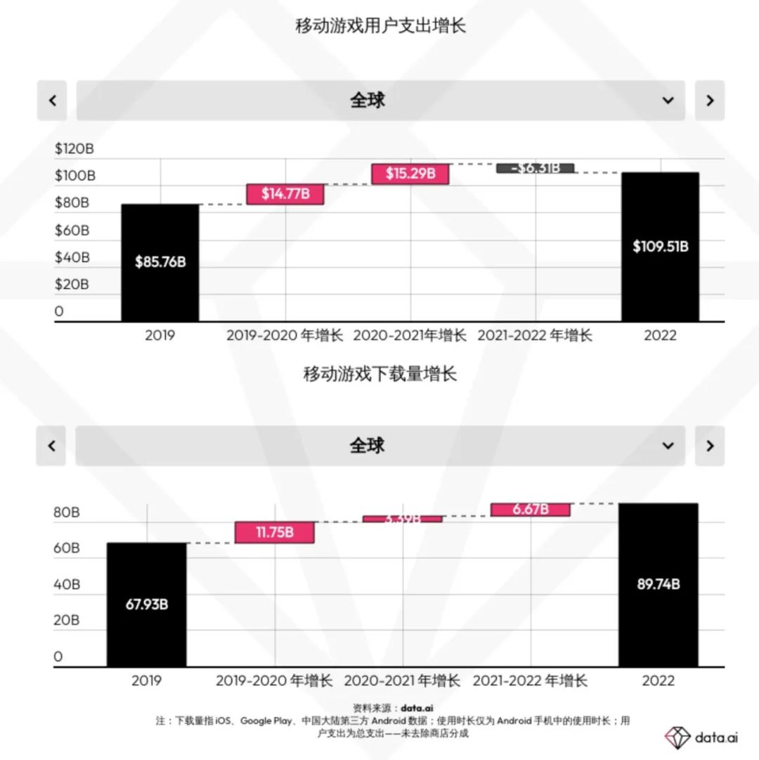 2022年用户在移动游戏上的支出下降了 5%,降至 1100 亿美元。但考虑到 2019 年的用户支出只有 860 亿美元,这可能只是长期增长趋势中的短期回调。