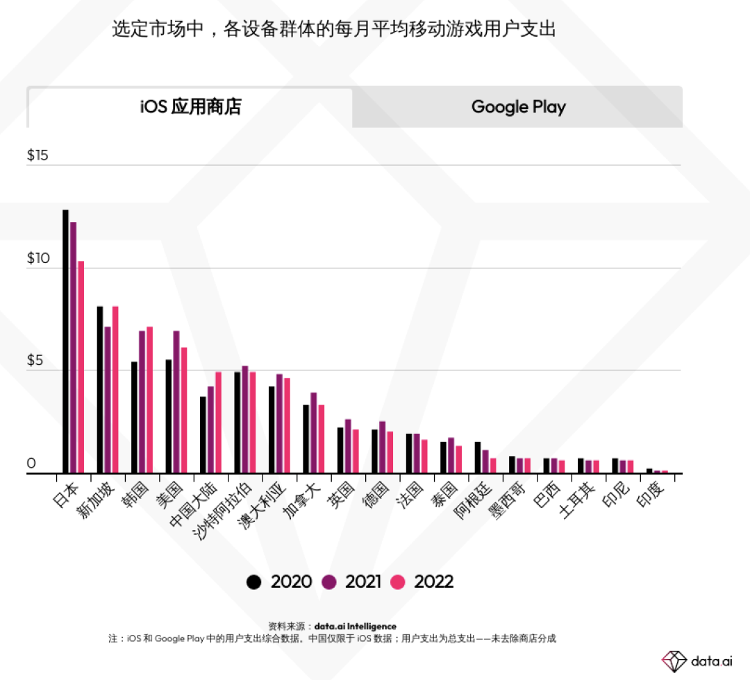 在全球范围内,日本用户在 iOS 上的支出最多,其在 2022 年,每台设备每月支出为 10.30 美元。其次是韩国和新加坡(这两个国家在 2022 年的支出都有所增加)。