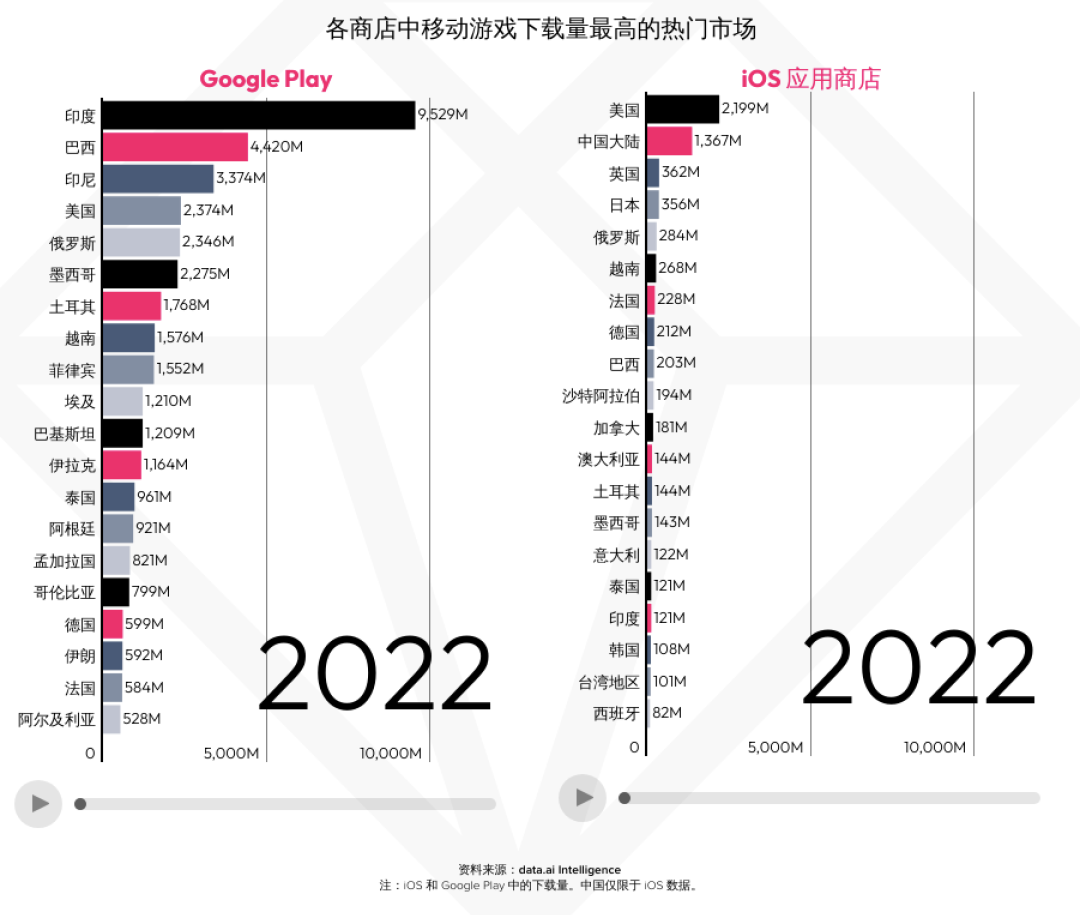 相反,iOS 平台的情况则截然不同,美国仍以 22 亿次下载量领先,其次是中国(14 亿次)。相比之下,印度的 iOS 游戏下载量仅为 1.21 亿次,比 Google Play 少了近 80 倍。