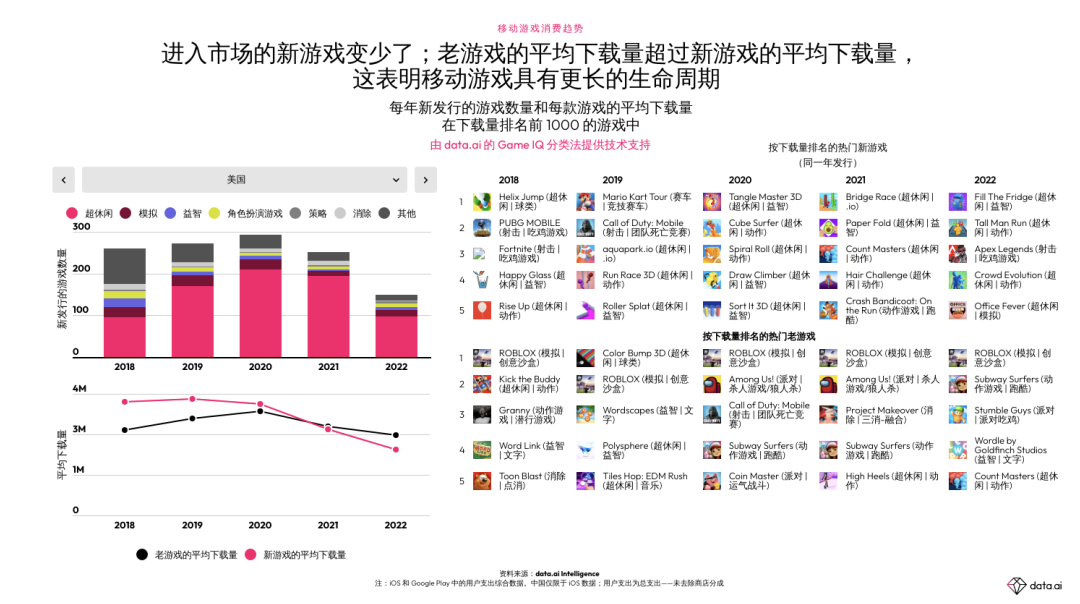 移动游戏也是如此吗?从 2022 年的数据来看,可能是这样。我们的研究显示,进入市场的新游戏越来越少,而且老游戏比新游戏有着更高的平均下载量。