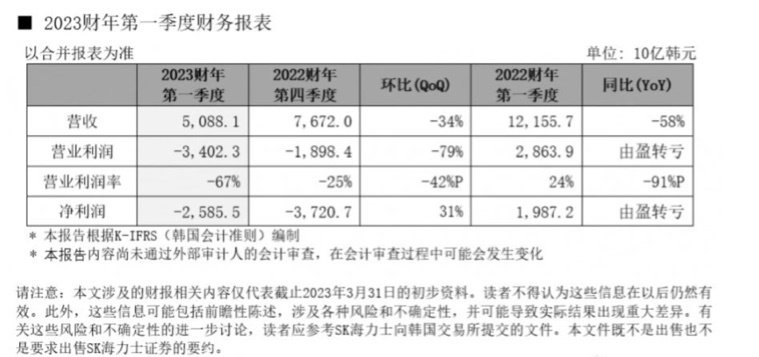 据外媒报道,在去年四季度出现巨额亏损,并导致全年利润大幅下滑的存储芯片厂商 SK 海力士,在今年一季度仍未能扭转亏损的局面,但好在净亏损环比已明显收窄。SK 海力士周三发布的财报显示,他们在今年一季度营收 5.088 万亿韩元(备注:当前约 263.05 亿元人民币),远不及去年同期的 12.156 万亿韩元,同比下滑 58%;也不及上一季度的 7.67 万亿韩元,环比下滑 34%。