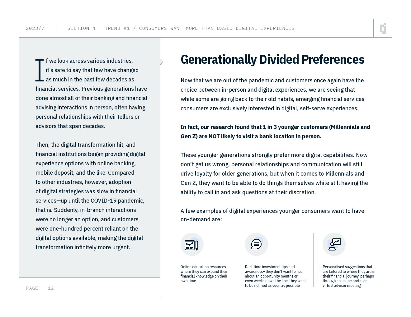 研究发现,1/3的年轻客户(千禧一代和 Z 世代)不太可能亲自前往银行网点。这些年轻一代非常喜欢更多的数字功能。当然,人际关系和沟通仍然会提高老一辈人的忠诚度,但对于千禧一代和 Z 世代来说,他们希望能够自己做事,同时还能打电话问问题,由他们自行决定。