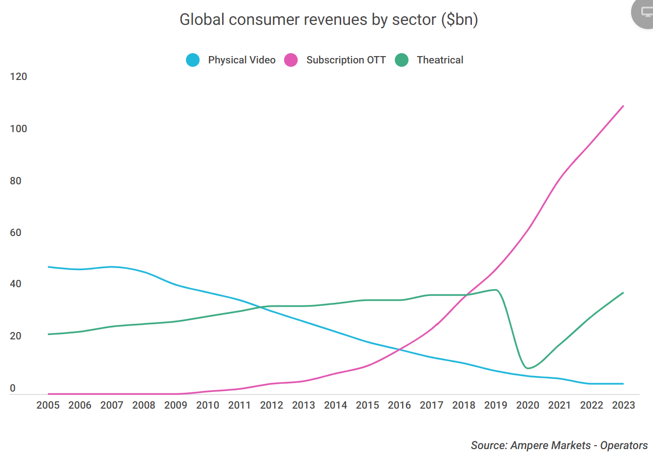 流媒体收入在 2016 年超过了当时下滑的实体视频市场,但仅在 2020 年超过了 DVD 的峰值。Netflix 退出租赁服务标志着家庭娱乐时代的结束。