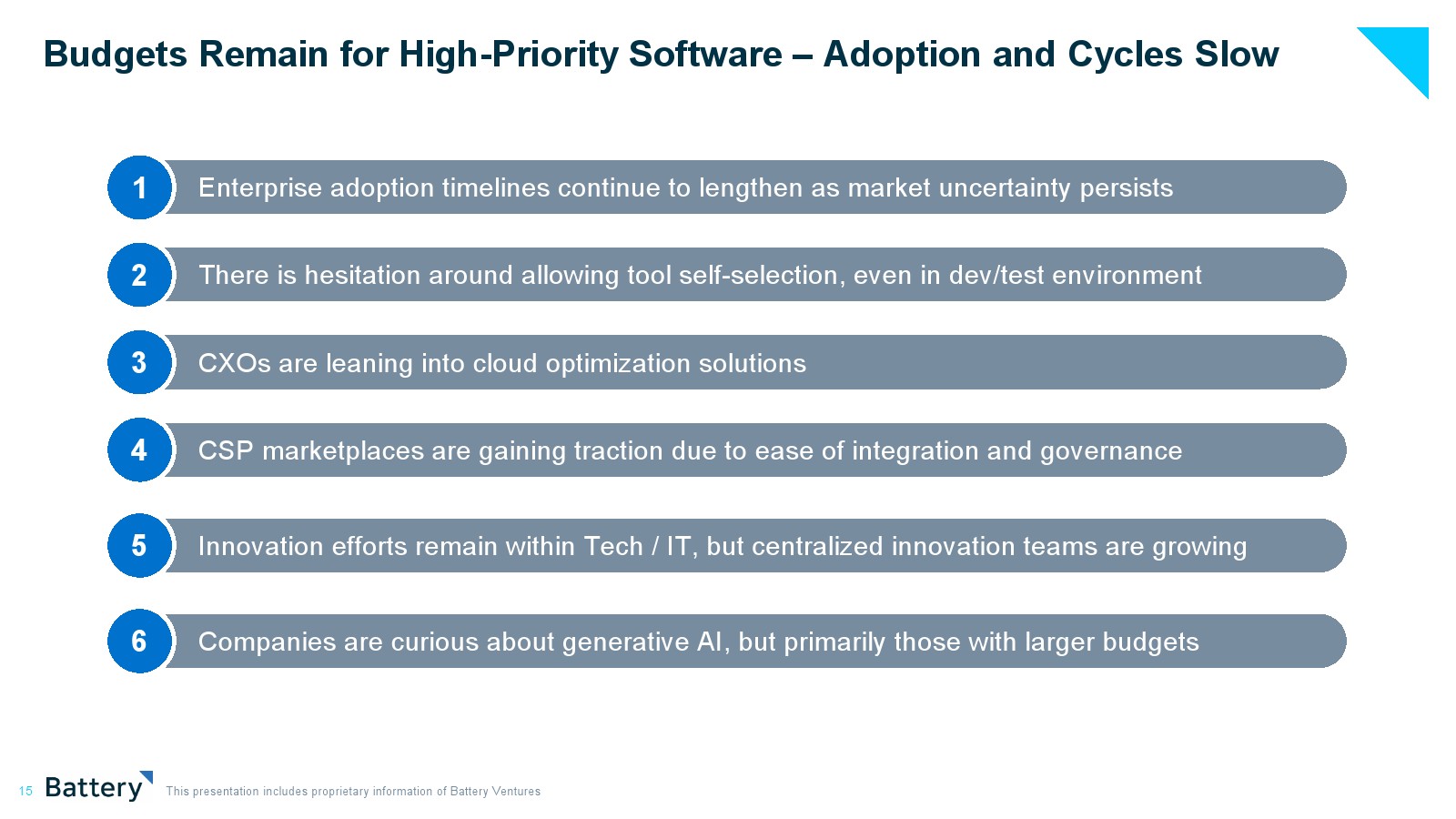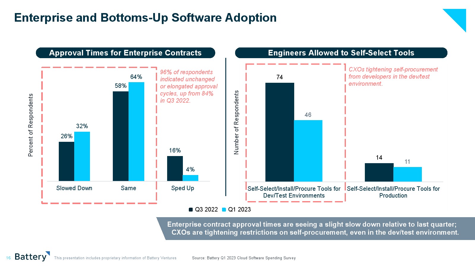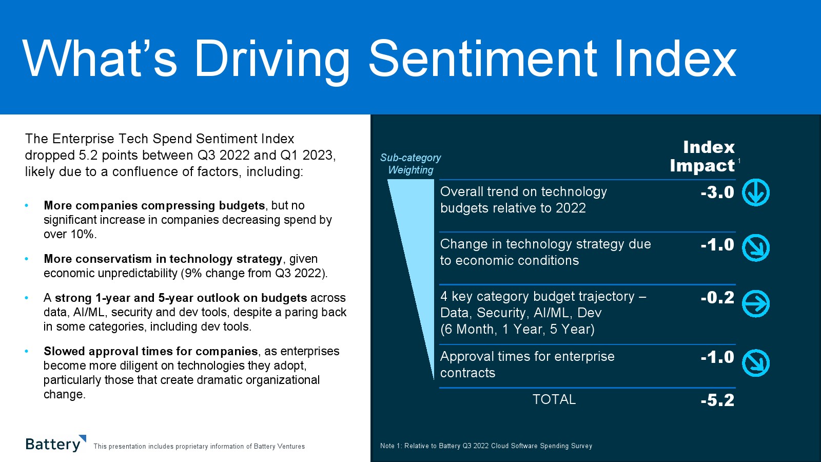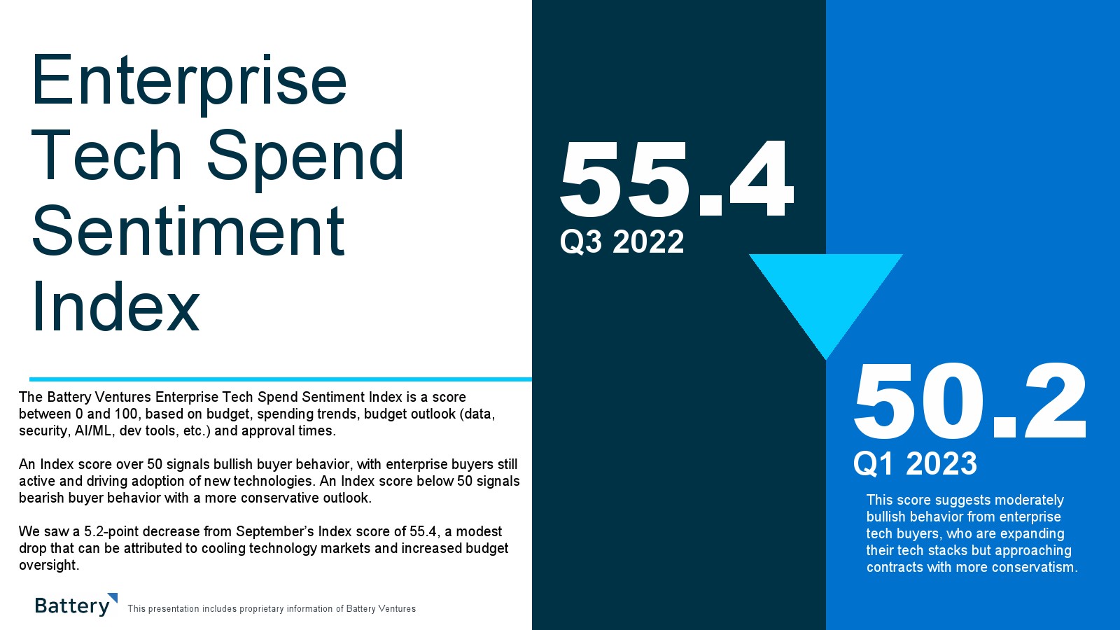 Battery的“企业技术支出情绪指数”基于预算、支出趋势、预算前景和批准时间。在这项 2023 年第一季度的调查中,该指数在 100 分制中得分为 50.2,其中“得分超过 50 表明买家行为看涨,企业买家仍然活跃并推动新技术的采用。”