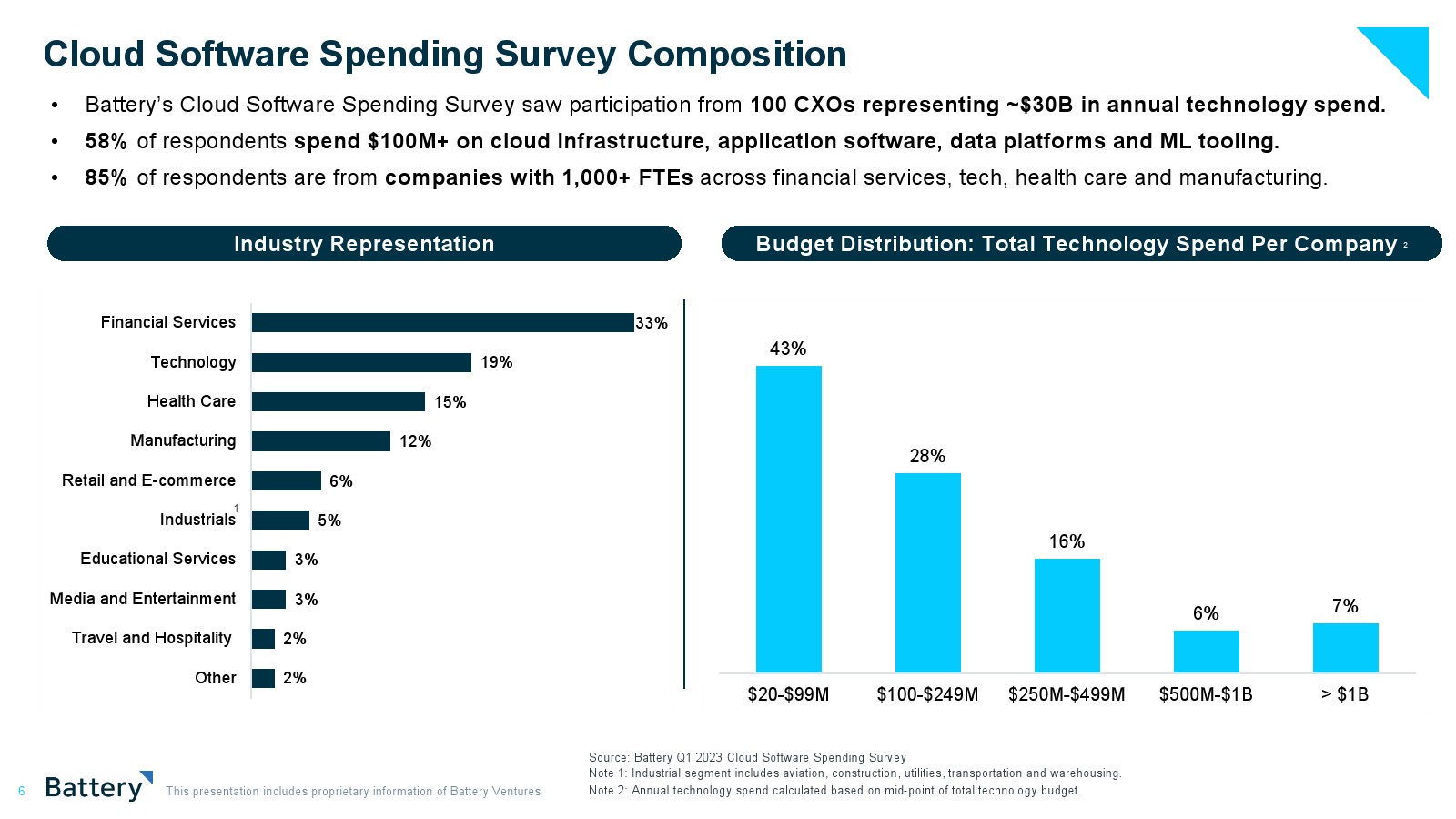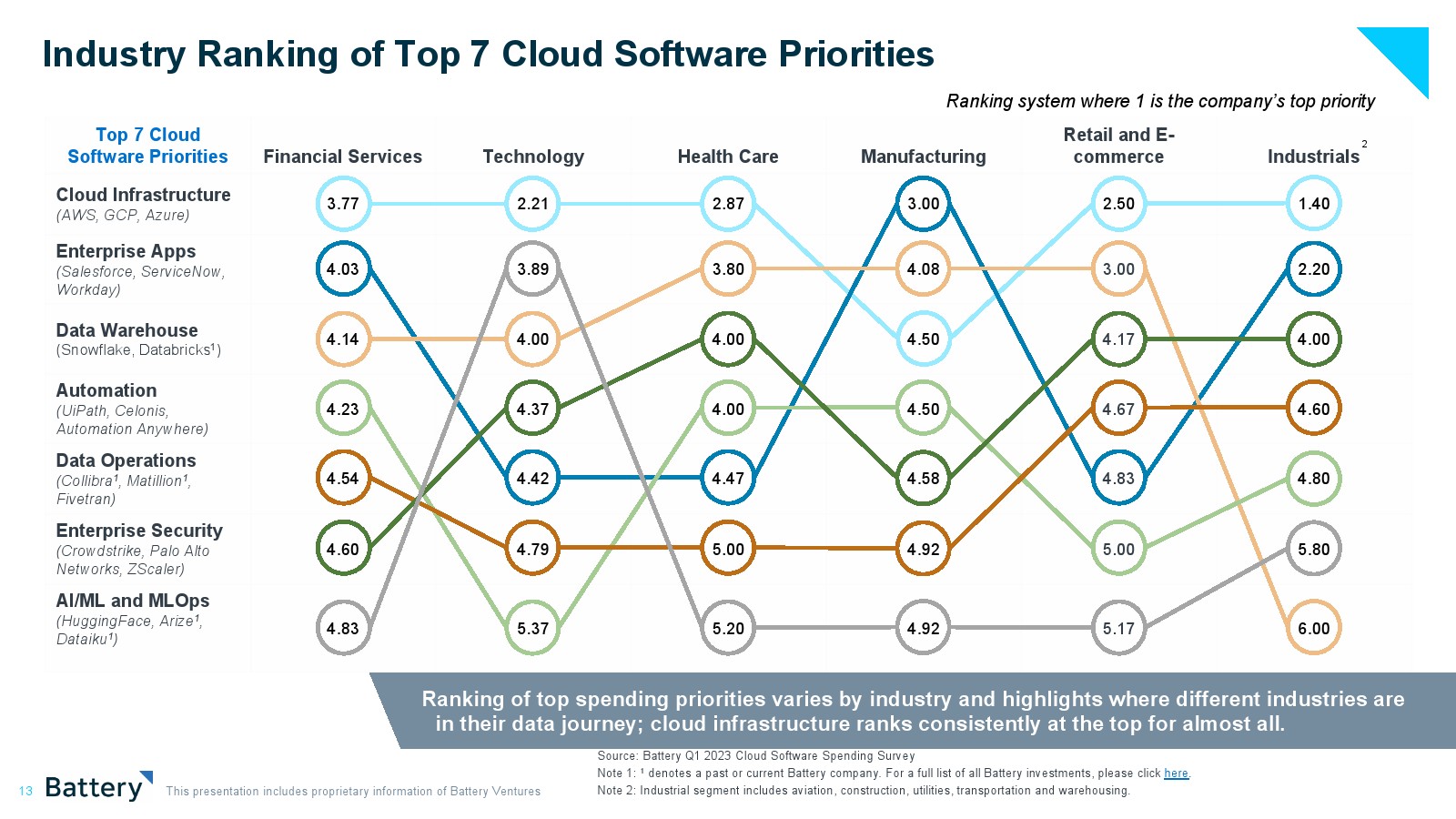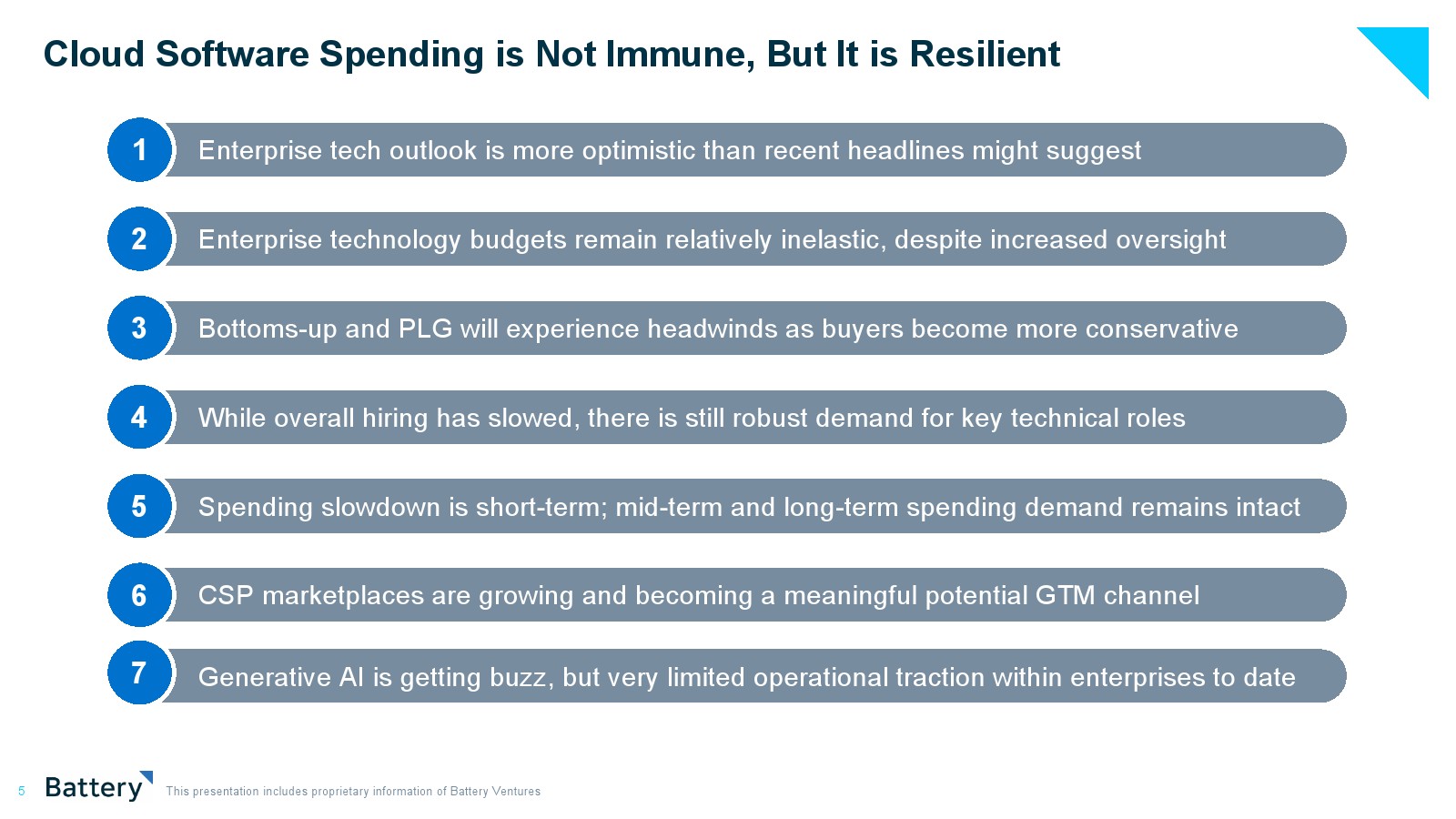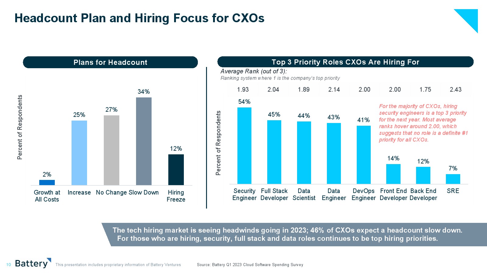 Battery的“企业技术支出情绪指数”基于预算、支出趋势、预算前景和批准时间。在这项 2023 年第一季度的调查中,该指数在 100 分制中得分为 50.2,其中“得分超过 50 表明买家行为看涨,企业买家仍然活跃并推动新技术的采用。”
