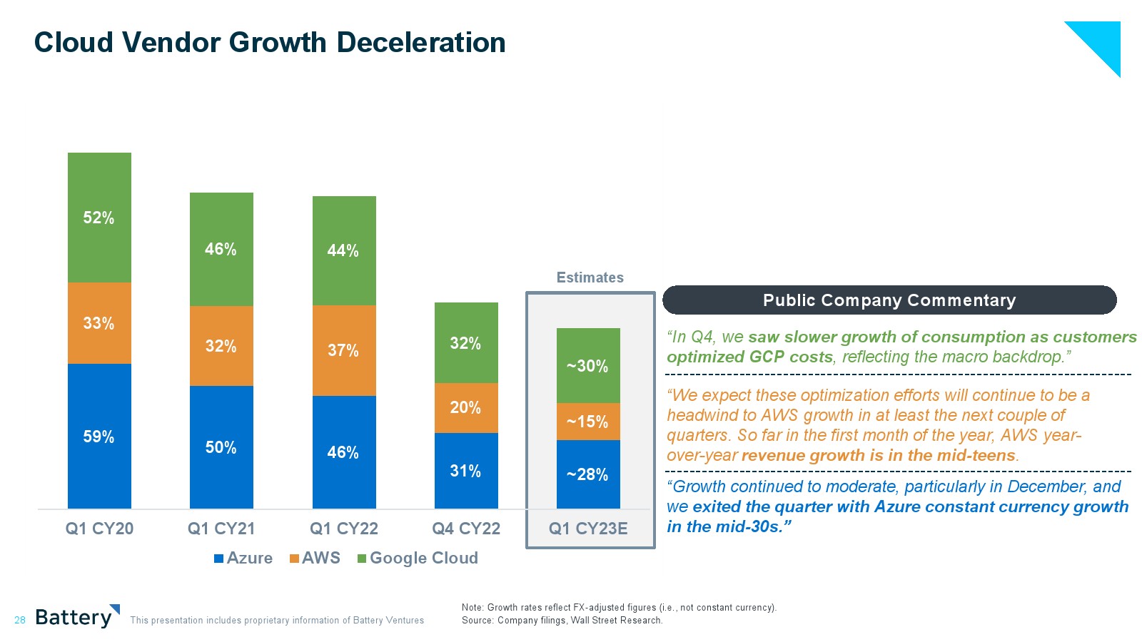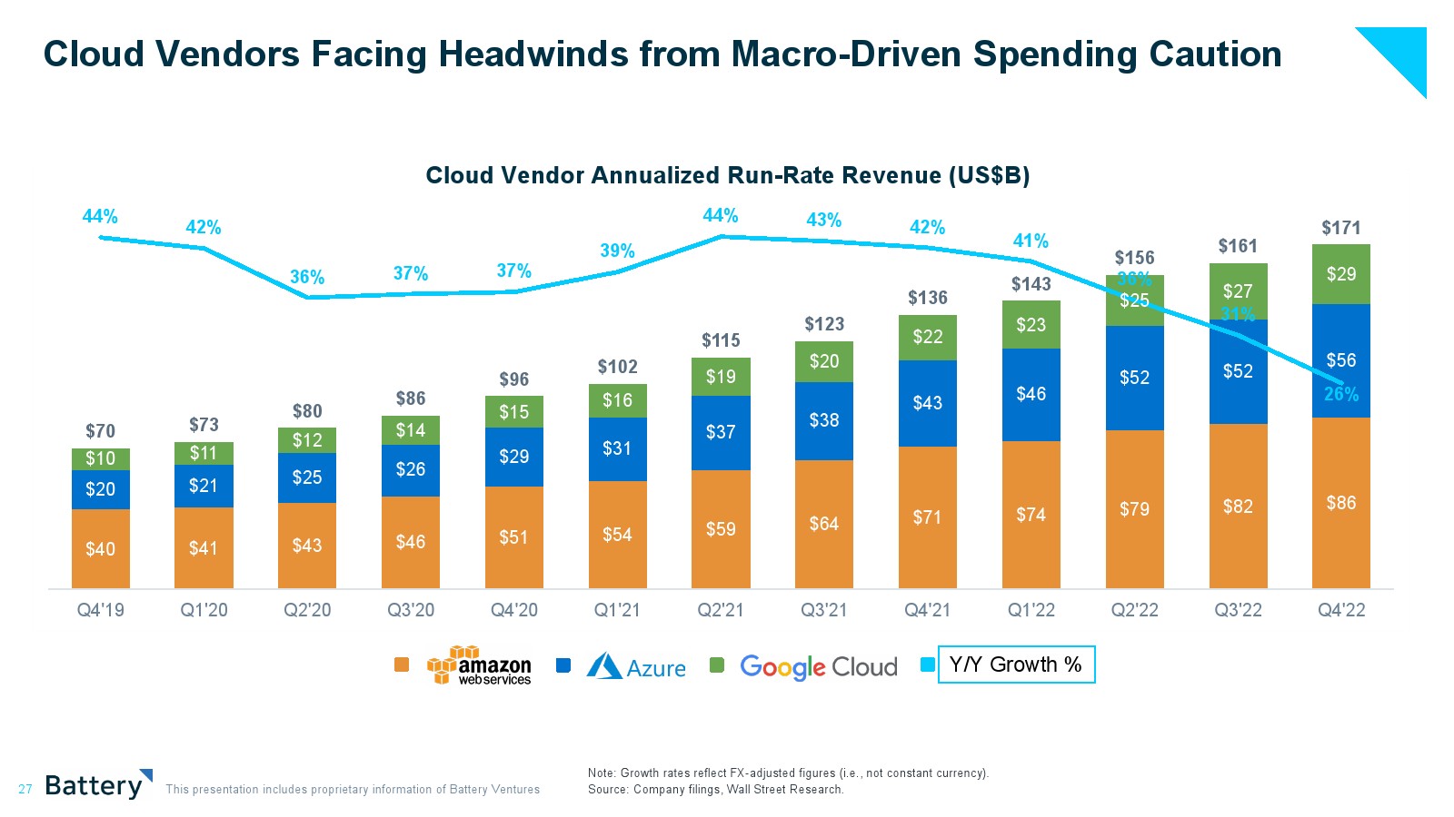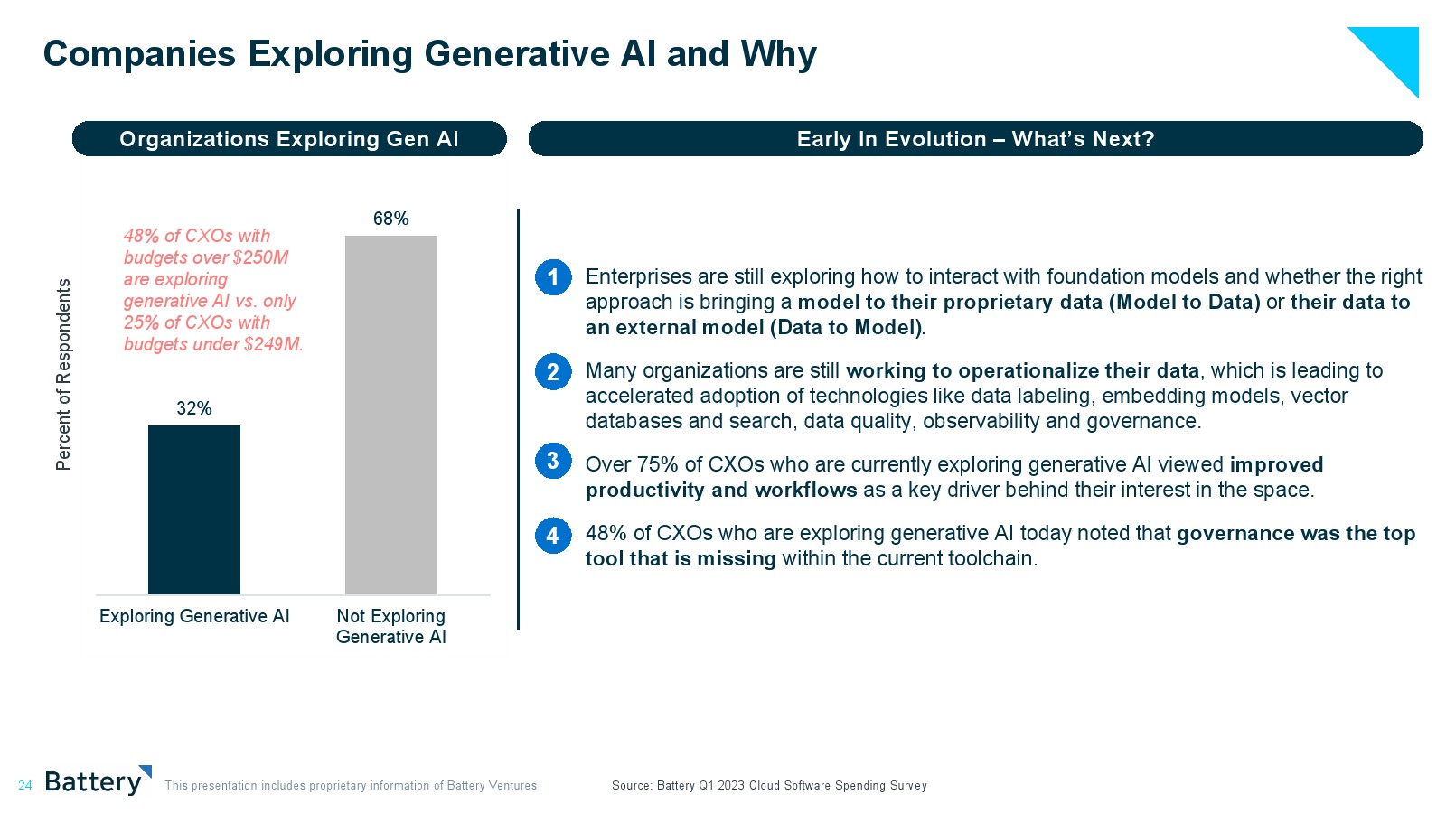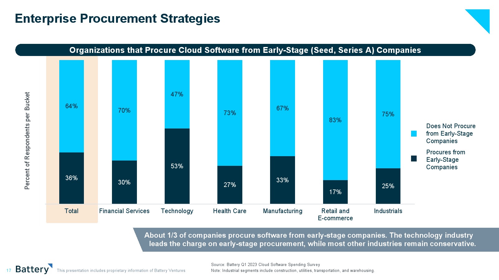 Battery的“企业技术支出情绪指数”基于预算、支出趋势、预算前景和批准时间。在这项 2023 年第一季度的调查中,该指数在 100 分制中得分为 50.2,其中“得分超过 50 表明买家行为看涨,企业买家仍然活跃并推动新技术的采用。”