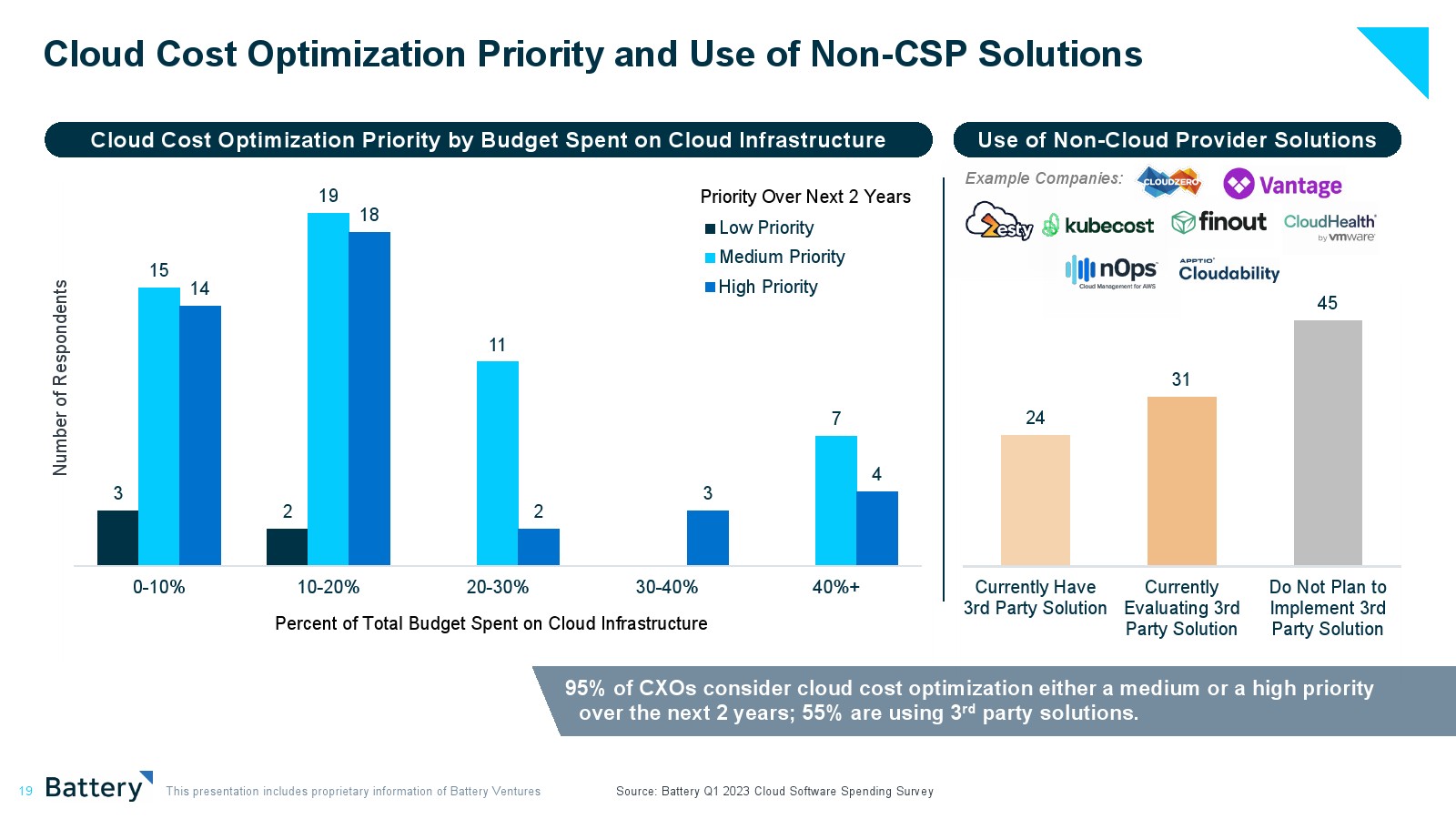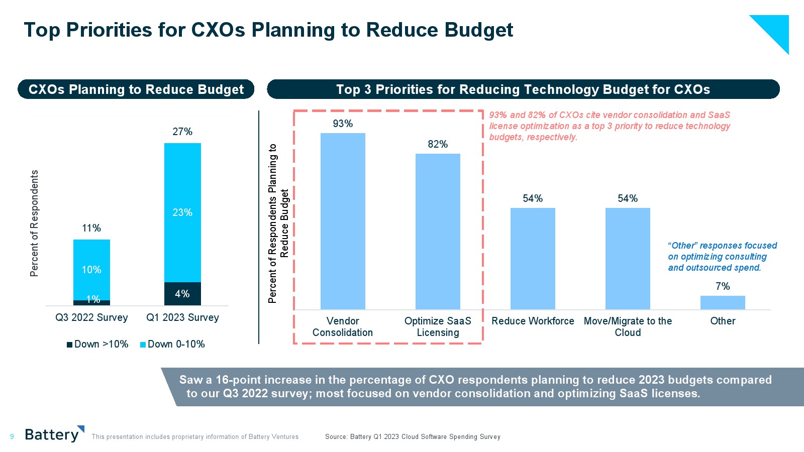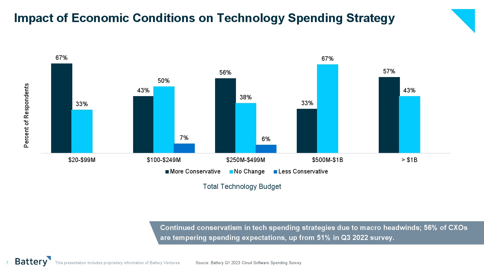 企业技术购买者正在降低他们的支出预期,Battery在其第一季度云软件支出状况调查中发现,56% 的CXO在技术支出策略上变得更加保守; 6个月前的调查有51% 的受访者这么表示。 但是,买家的整体科技支出情绪仍然温和乐观。