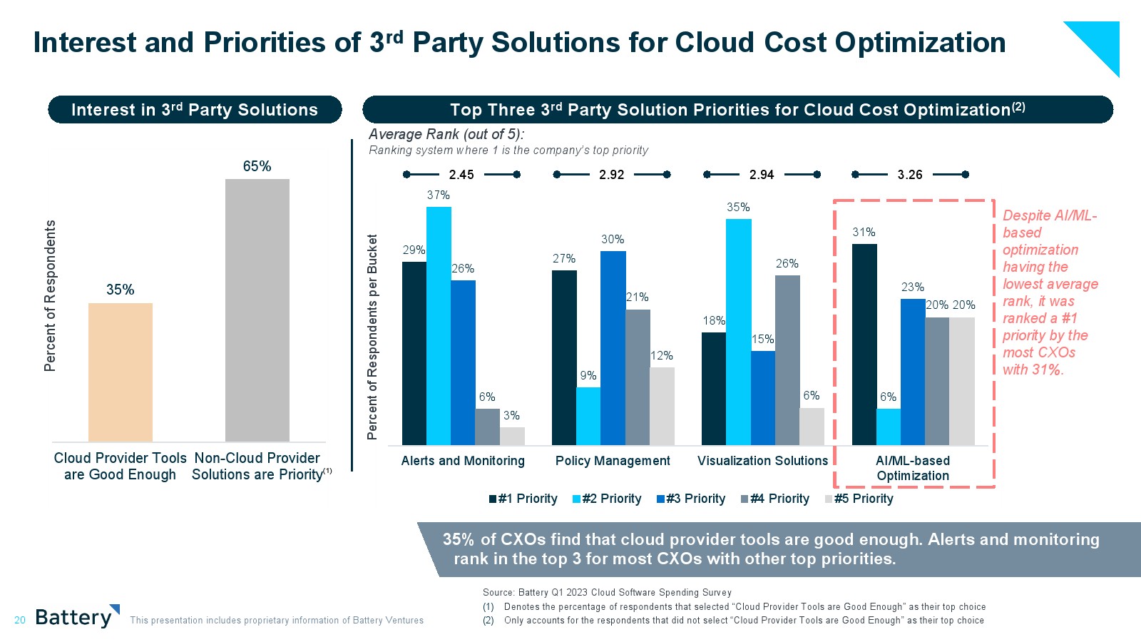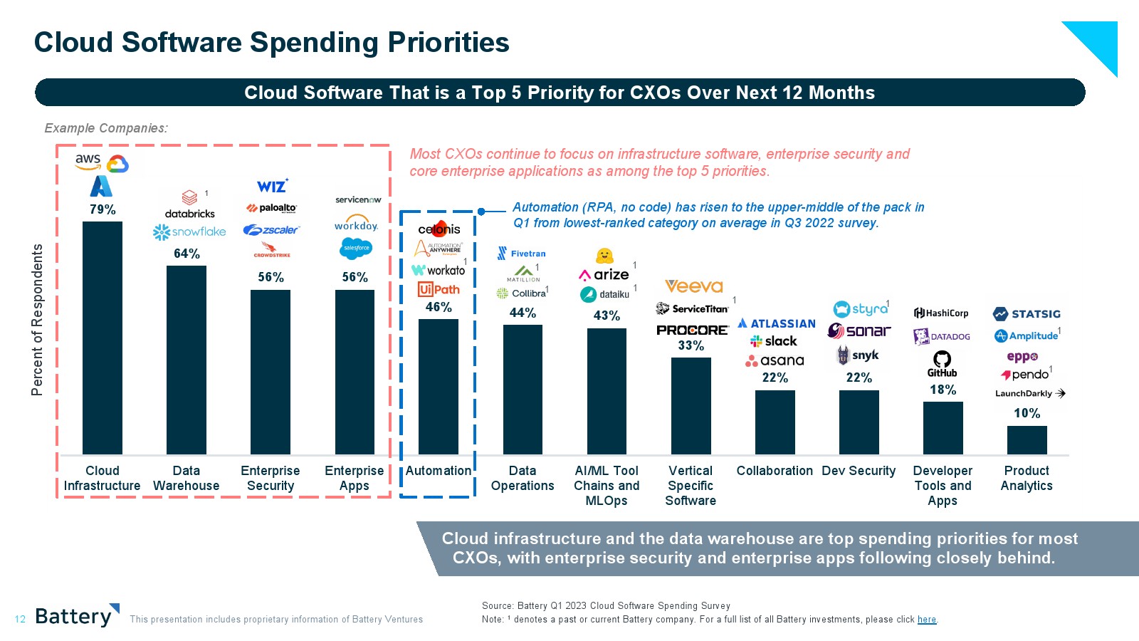 与此同时,在 CXO 明年优先考虑的云软件类型中,云基础设施处于领先地位,其次是数据仓库。 值得注意的是,在 2022 年第三季度的调查中,自动化排名最低,之后进入前 5 名。