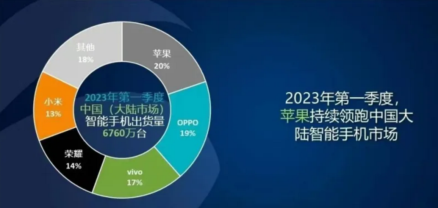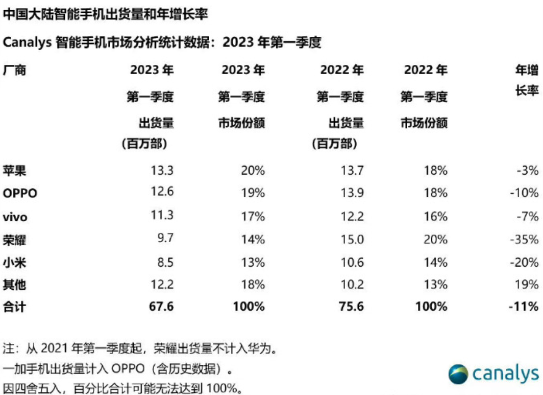 市场调研机构Canalys送出了今年第一季度中国智能手机市场的报告,跟之前预判的一样,苹果依然稳居第一。报告中显示,苹果今年Q1卖出了1330万部,市场份额20%,跟去年同期相比下滑了3%。紧随其后的是OPPO和vivo,对应的出货量是1260万部和1130万部,市场份额分别是19%和17%,跟去年同期相比下滑了10%和7%。