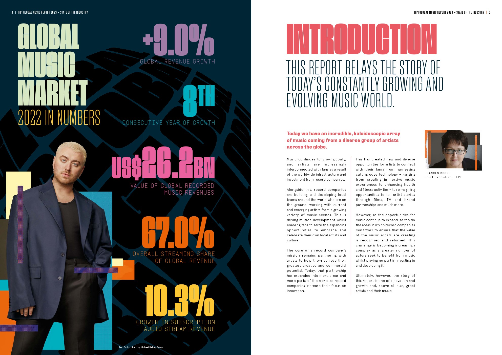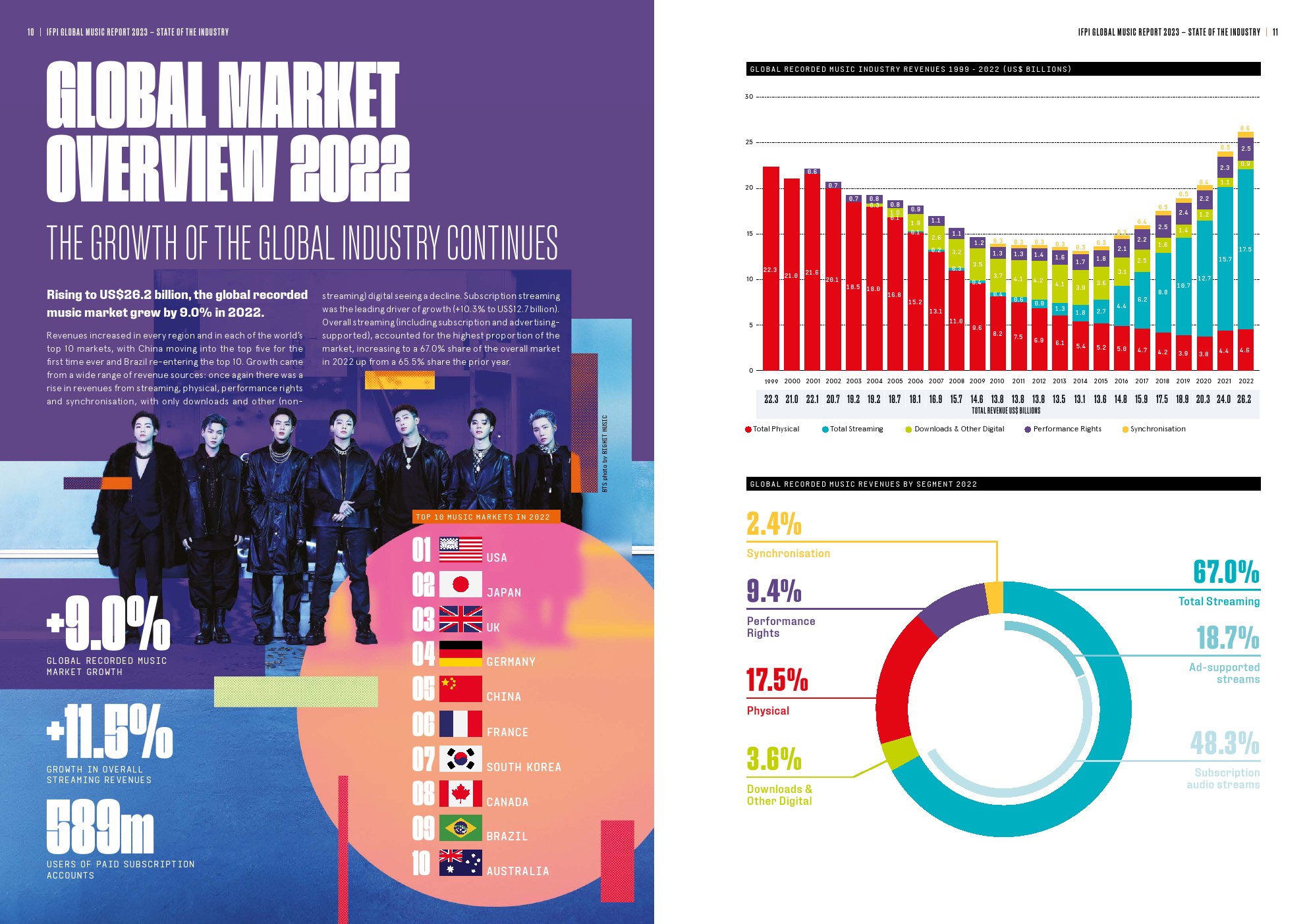 国际唱片业协会(IFPI)发布了“2023年全球音乐报告”,受付费订阅流媒体的推动,全球唱片音乐市场在2022年增长了9.0%,总收入为262亿美元。