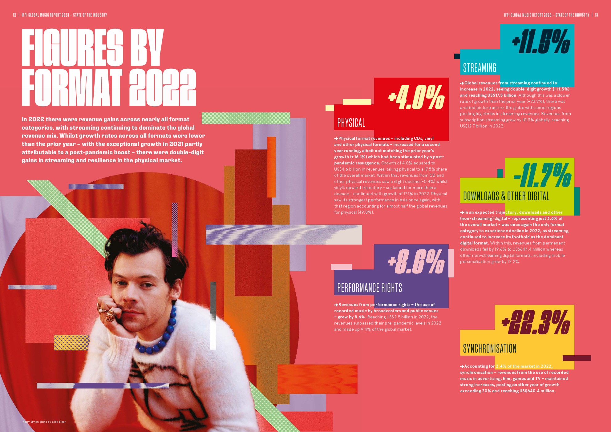 截至2022年底,订阅音频流媒体收入增长10.3%,达到127亿美元,付费订阅用户达到5.89亿人。流媒体总收入(包括付费订阅和广告支持)增长了11.5%,达到175亿美元,占全球录制音乐总收入的67.0%。其他分支也有增长,实体收入保持弹性(+4.0%);表演权收入增长8.6%,恢复到大流行前的水平。