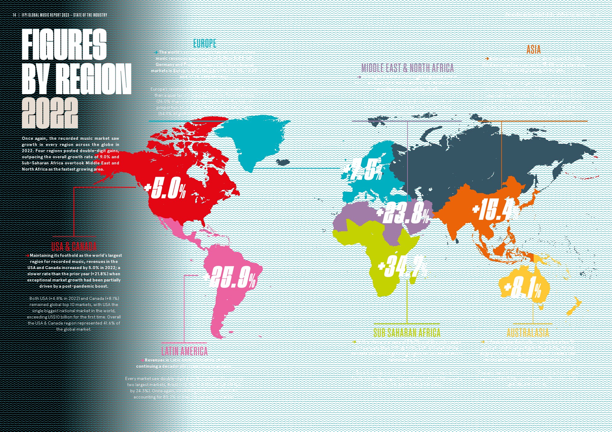 - 撒哈拉以南非洲地区——2022年以超过30%(34.7%)的增长率成为增长最快的地区,这主要得益于该地区最大市场南非(+31.4%)音乐收入的大幅增长。