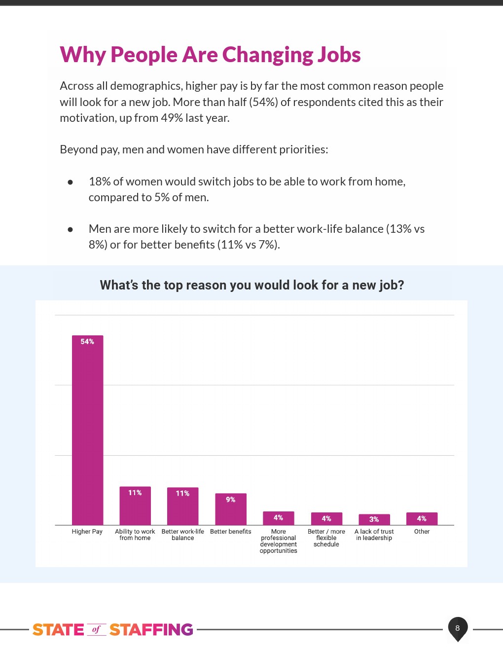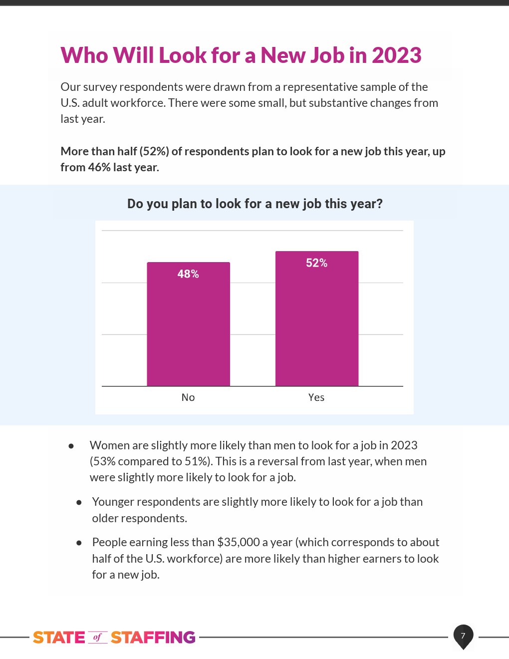 和去年一样,除了年度行业调查,Staffing Hub还询问了500多名公众关于他们的求职计划。结果表明,我们在过去几年看到的重组模式仍在继续。超过一半的受访者表示,他们计划在2023年找一份新工作,最主要的原因是为了更高的薪水。