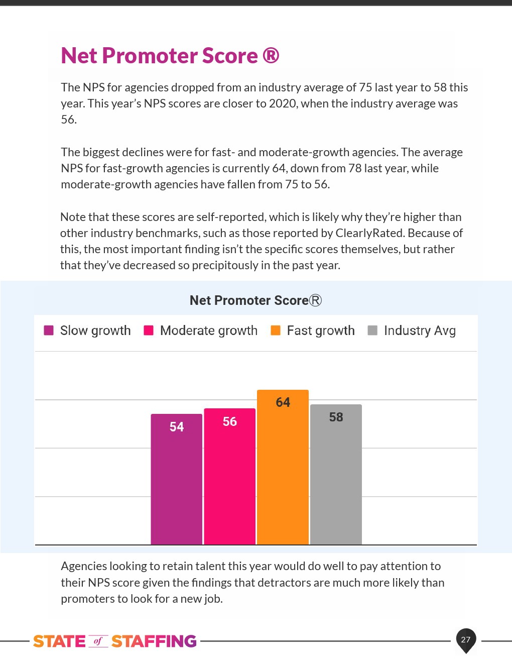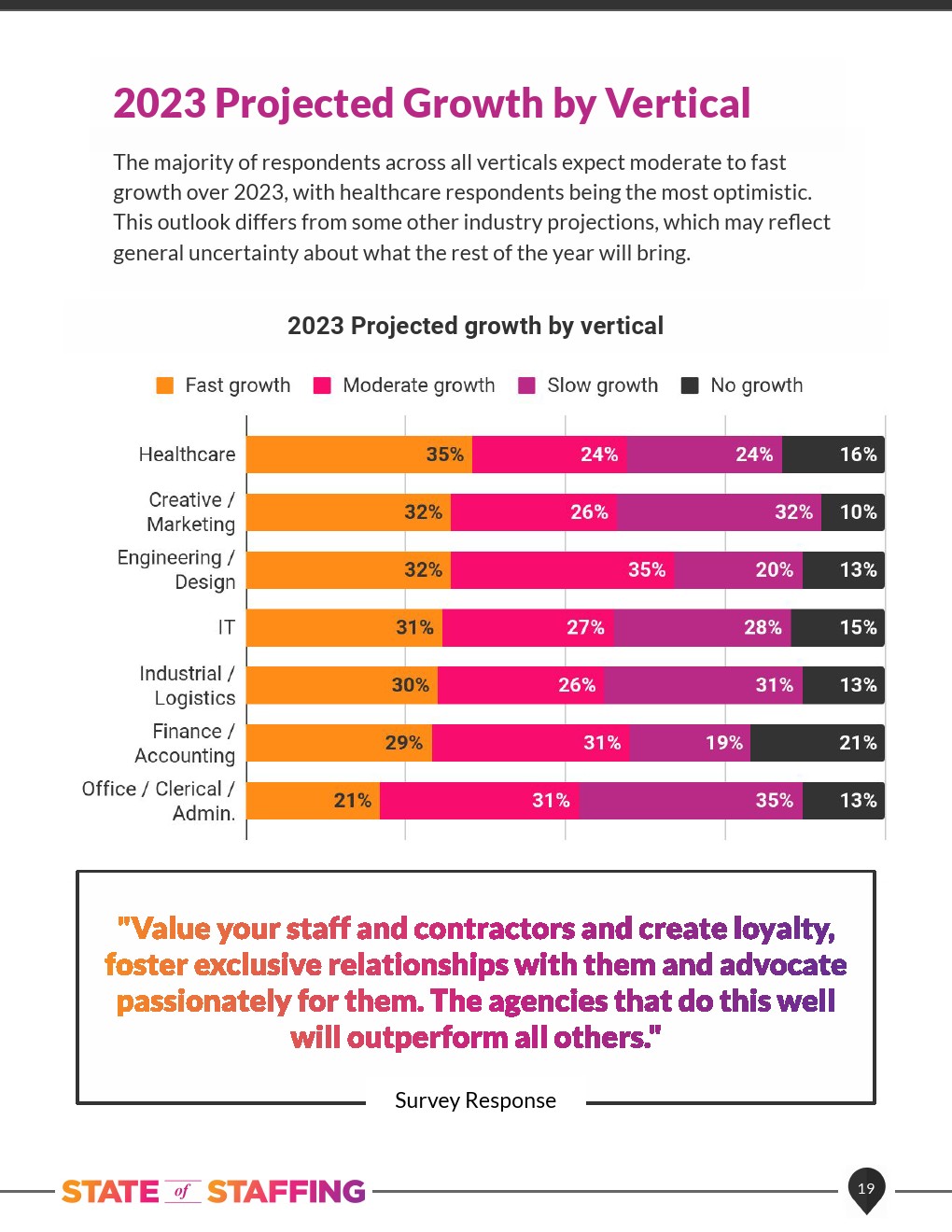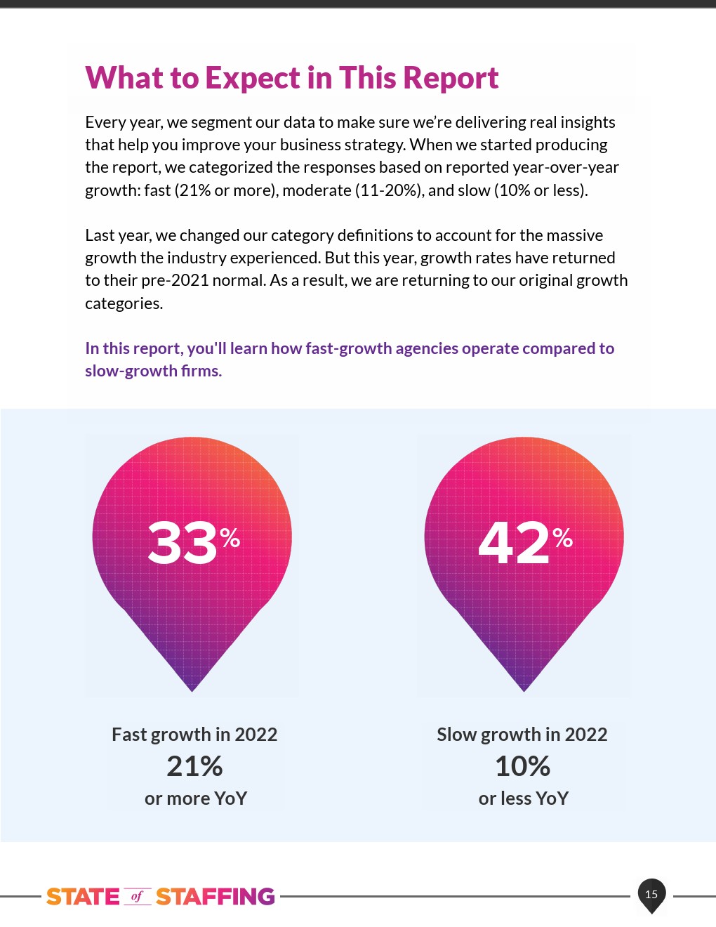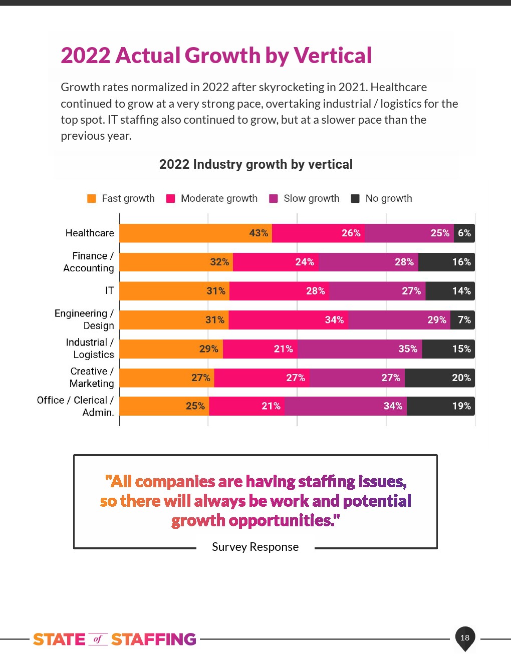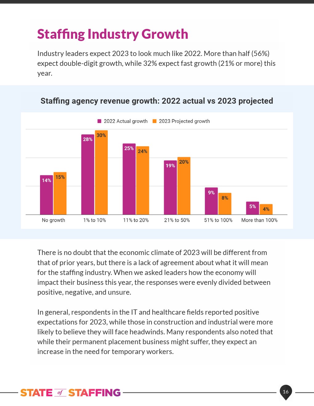 Staffing Hub发布了“2023年人力资源报告”。在经历了2021年创纪录的增长之后,人力资源行业于2022年回归正轨。1/3的受访者(33%)表示,他们的代理机构去年增长了20%以上,这与2021年之前的典型增长率一致。