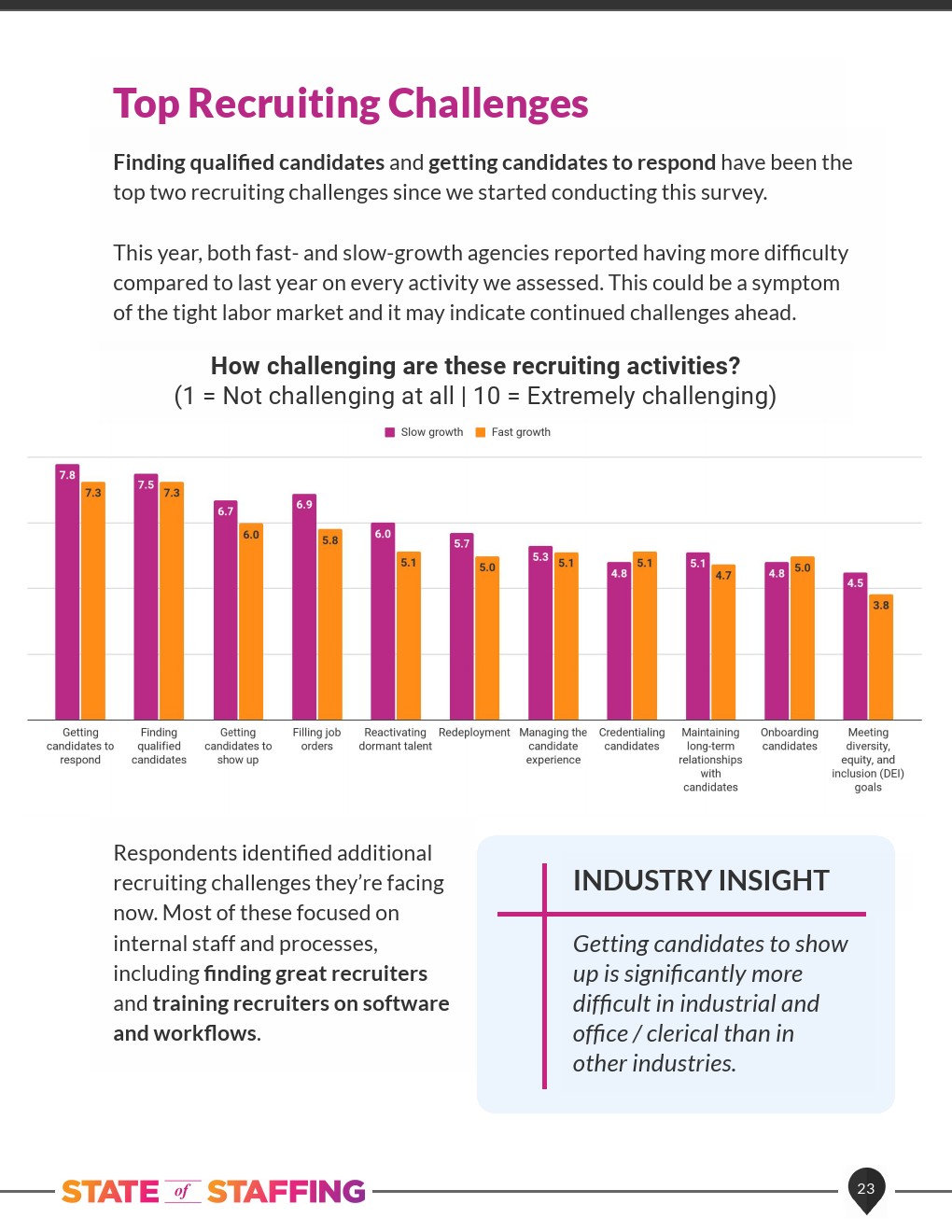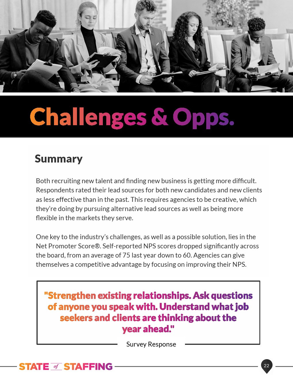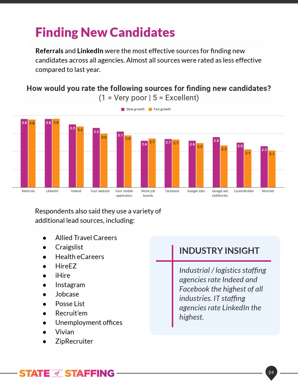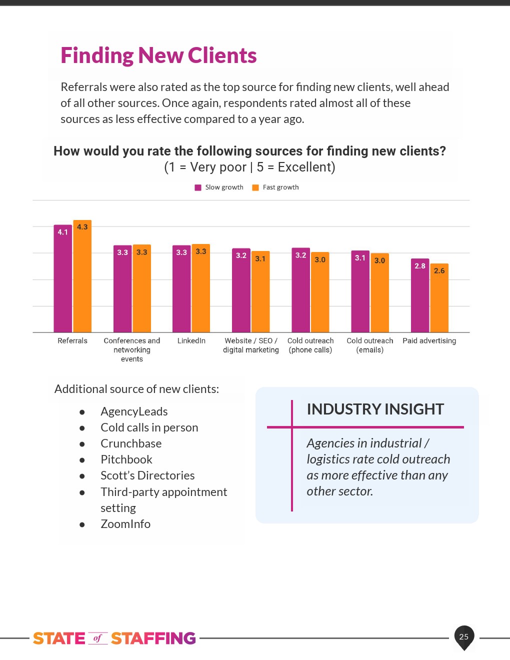 招聘新人才和寻找新业务都变得越来越困难。受访者认为他们的新候选人和新客户的主要来源都不如过去有效。这就要求代理商要有创意,他们正在通过寻找替代的人才以及在他们所服务的市场中更加灵活的活动应对挑战。