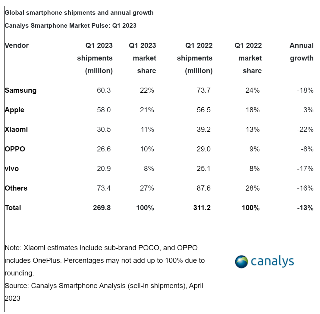 Canalys的最新研究显示,全球智能手机出货量在2023年第一季度下降了13%,至2.698亿部。需求下降已经开始趋于平缓,尽管2022年第一季度和2023年第一季度之间的对比仍然明显。在更新产品组合的推动下,三星重新夺回了第一的位置,出货量为6030万部。苹果以5800万部的出货量位居第二。它是前五名中唯一一家实现同比增长的供应商,这使它的市场份额达到了21%。小米以3050万部的出货量保住了第三的位置,OPPO和vivo分别以2660万和2090万部的出货量位居前五,占10%和8%的市场份额。