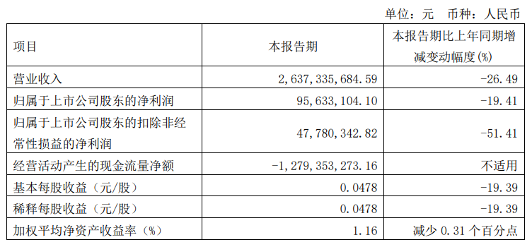 近日消息,东风汽车(600006)公布一季度财报,营业收入 26.37 亿元,同比下降 26.49%;归属于上市公司股东净利润 9563 万元,同比下降 19.41%;扣除非经常性损益的净利润 4778 万元,同比下降 51.41%;基本每股收益 0.0478 元,同比下降 19.39%。