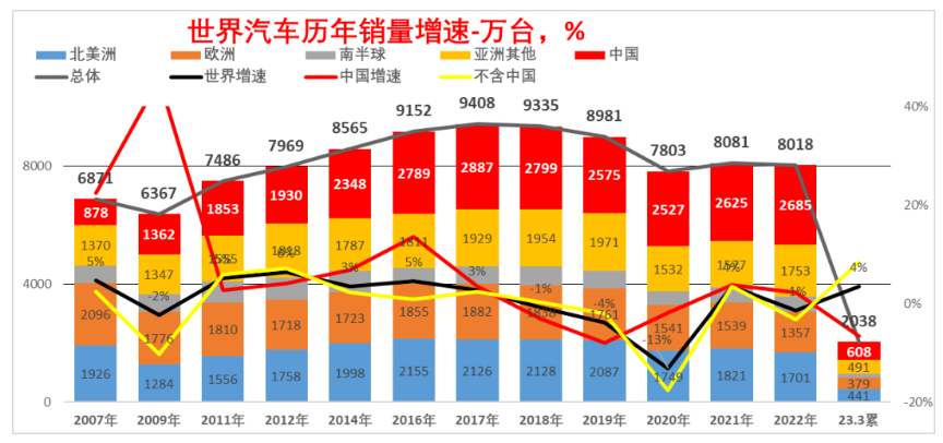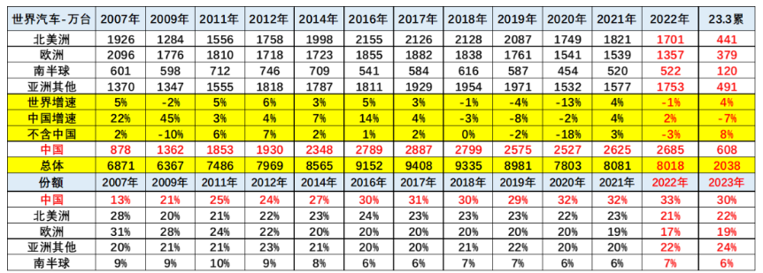 中国汽车市场对世界汽车市场影响力极其巨大。2016-2018 年中国汽车占世界 30% 左右,2019 年下降到 29%,但仍具有绝对优势。2020-2021 年国份额回升到 32%。2022 年中国份额上升到 33%。