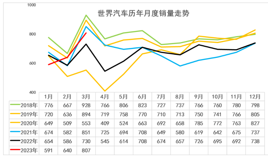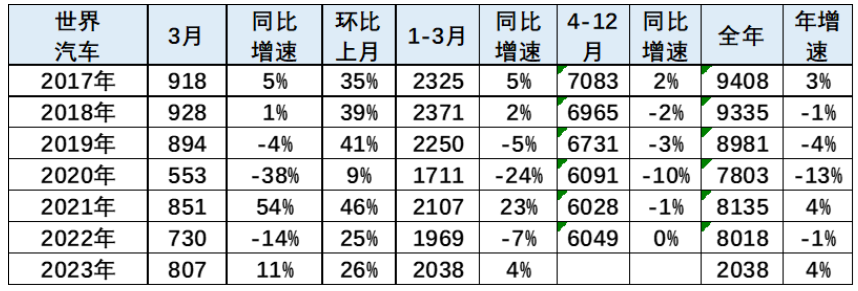 近日消息,全国乘用车市场信息联席会秘书长崔东树公众号发文,2023 年 3 月的世界汽车销量达到 807 万台,同比增 11%;1-3 月世界汽车销量达到 2038 万台,同比增长 4%。2023 年中国车企的世界累计份额达到 30%。