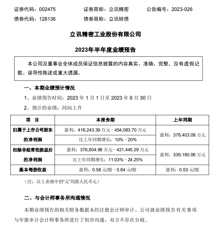 近日消息,立讯精密发布了 2023 半年报预告,预计公司 2023 年上半年净利润约为 41.62 亿元 —45.41 亿元,同比增长 10%–20%。