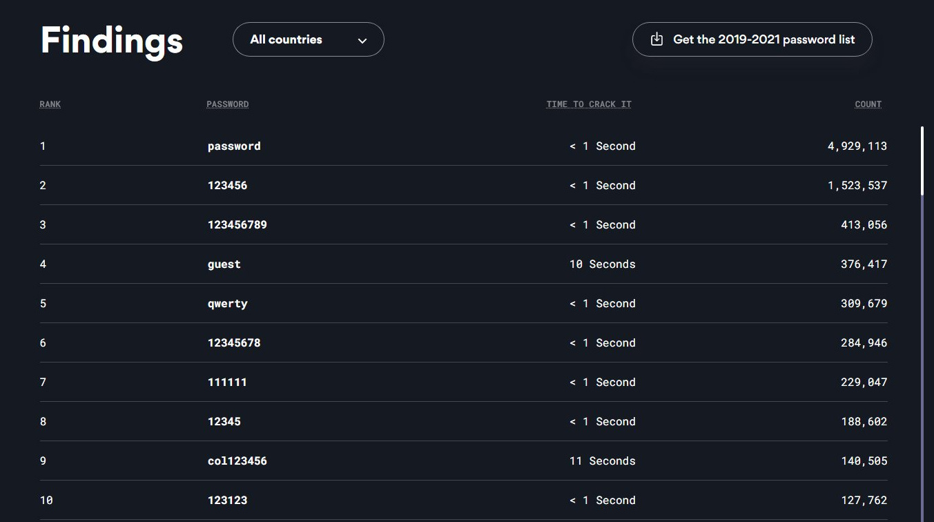 NordPass:数据显示全球最常用的密码是“password” 近日消息,NordPass 为迎接 5 月 4 日的世界密码日(World Password Day),在评估了超过 3TB 的数据之后发布最新报告,确认了 30 个国家和地区的最常用 200 个密码。 报告中指出:“尽管网络安全意识不断增强,但旧习惯很难改掉。研究表明,人们仍然使用弱密码来保护他们的账户”。在前十榜单中,8 个密码可以在不到 1 秒内完成破解。最常用的密码是“password”。 附全球最常用的 10 个密码如下: 自 IT之家 更多阅读:NordPass:2023年最糟糕的密码毫无变化 “123456 “排在第一位Outpost24:数据显示认为IT管理员也应为密码使用不力承担责任 最爱用的是”admin”NordPass:2021年最常见密码榜单 榜首仍是“123456”YouGov:2/5的千禧一代在全部网络账号中使用相同密码大数据告诉你什么样的密码最牢靠!Gigya:下一代生物验证崛起 80%的消费者认为更安全Cybersecurity Ventures:2031年全球因勒索软件造成的损失预估超过2650亿美元Surfshark:2022年网络犯罪密度报告 英美首当其冲Atlas VPN :苹果公司向在其服务中发现漏洞的研究人员支付金额是三星的五倍多UCSD:研究发现全球近1/4互联网基础设施易受攻击游戏开发者联盟:调查显示70%的游戏开发者对实时服务可持续性表示担忧美国财政部:2021年勒索事件支付赎金将近6亿美元 超过去年全年Verizon:2018年数据泄露调查报告Barracuda:2023年3月恶意HTML附件10个月数量翻番 占比达到45.7%中国茶叶流通协会:2021年中国茶叶产销形势报告——种植生产